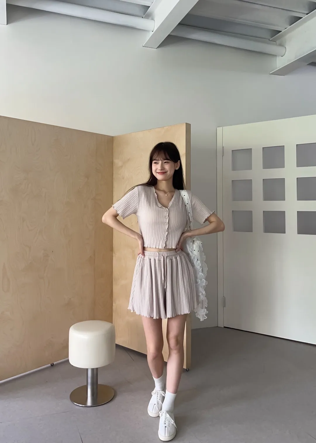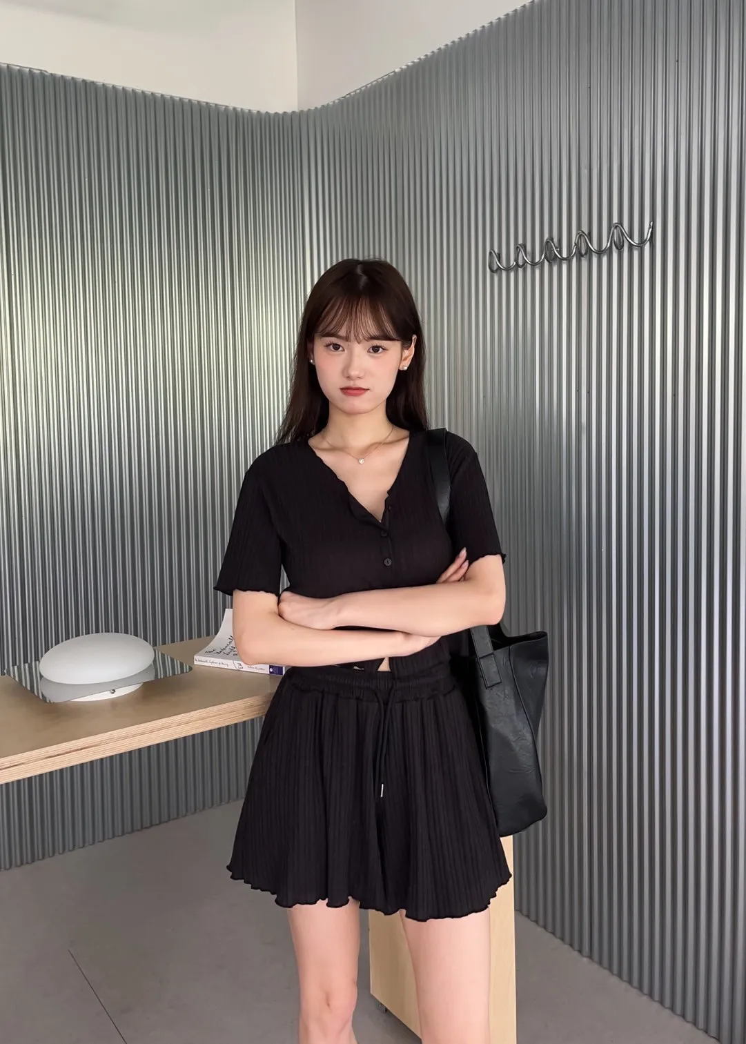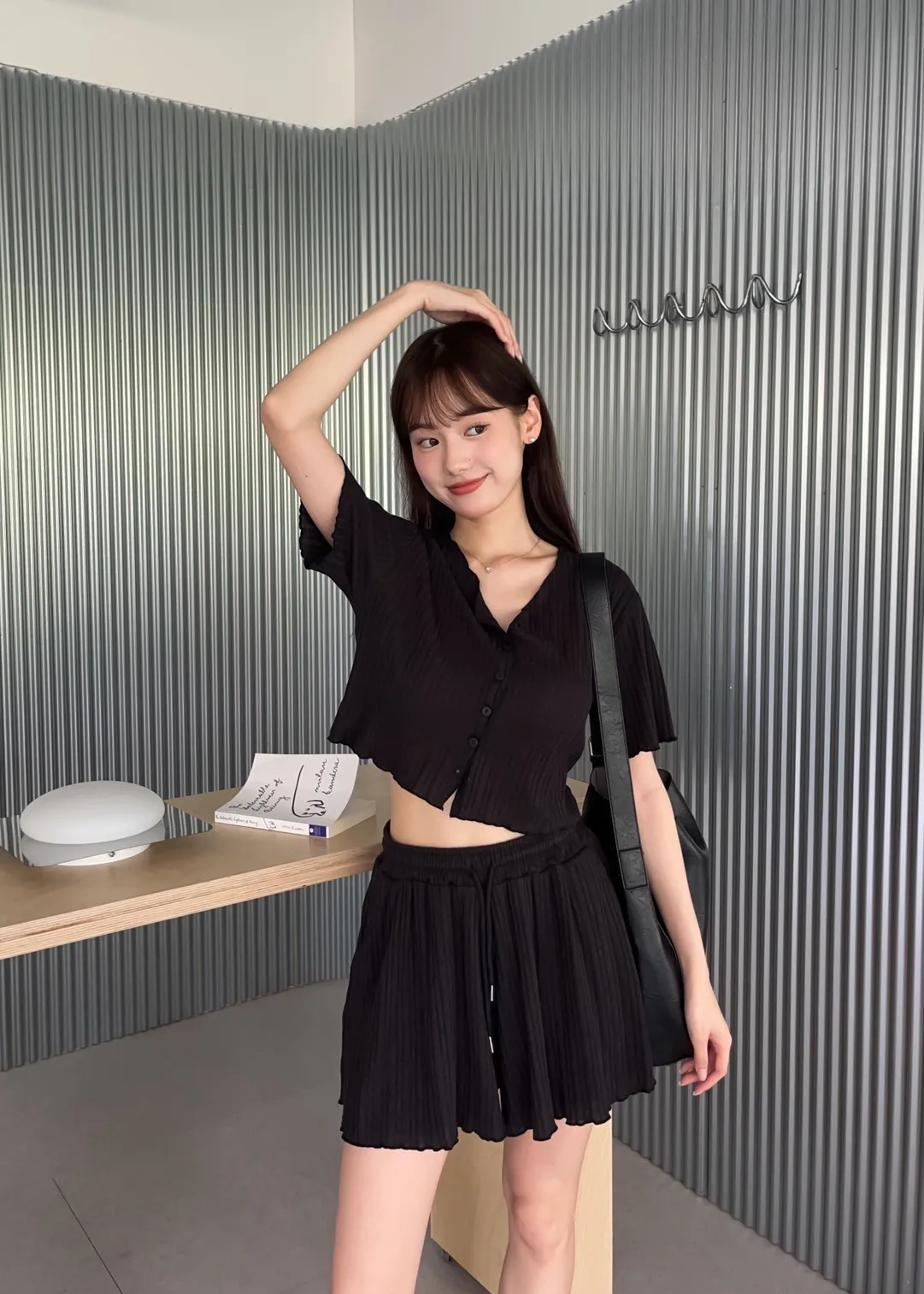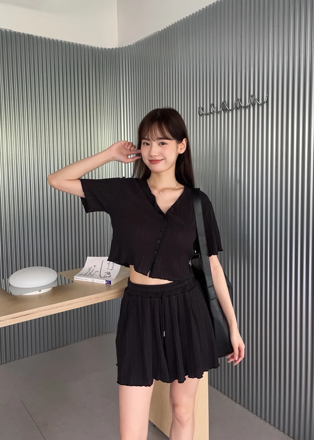 sm1504(She made)浪漫捲邊排扣上衣+捲邊短褲(米/藕粉/黑)(售完不補)