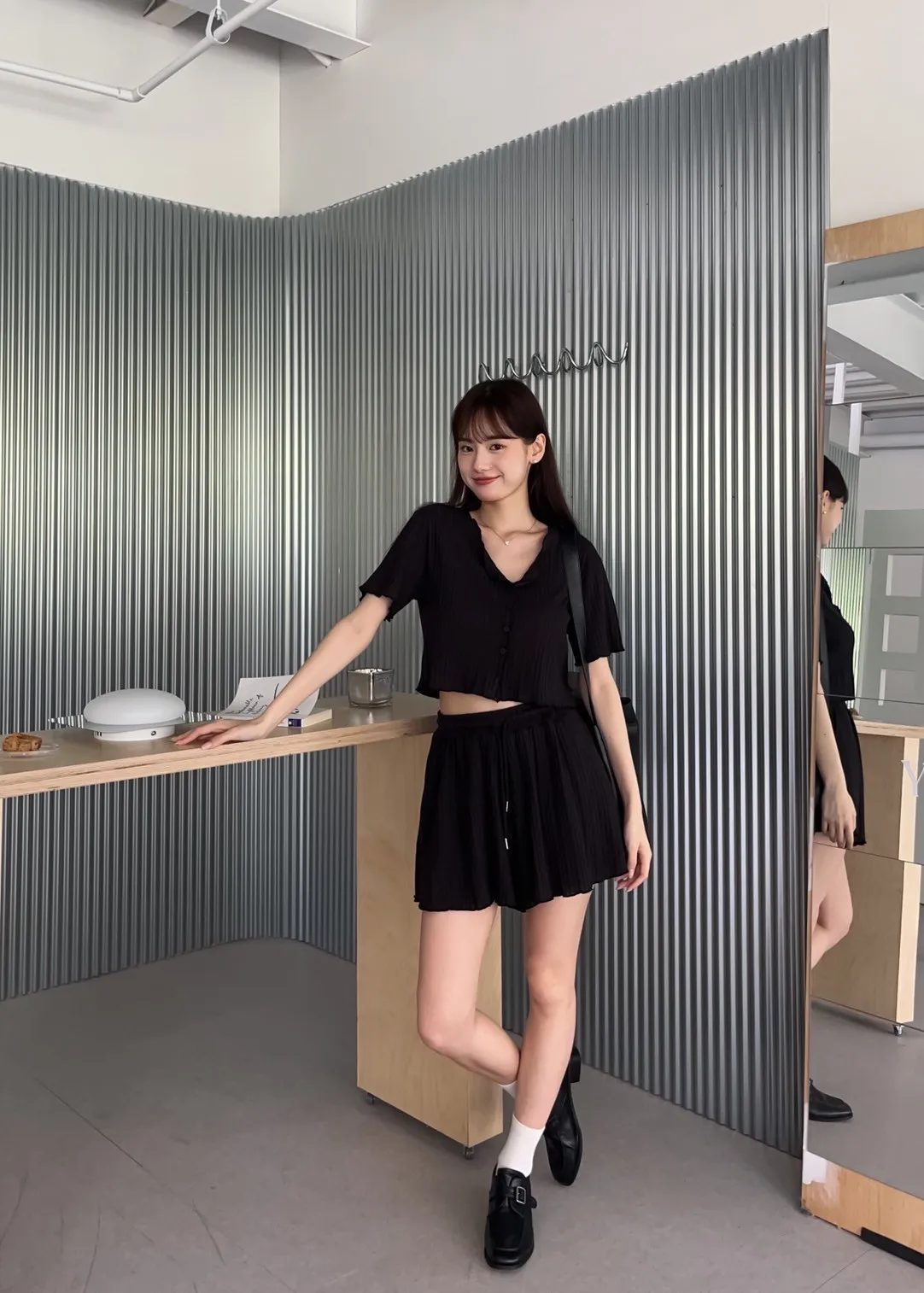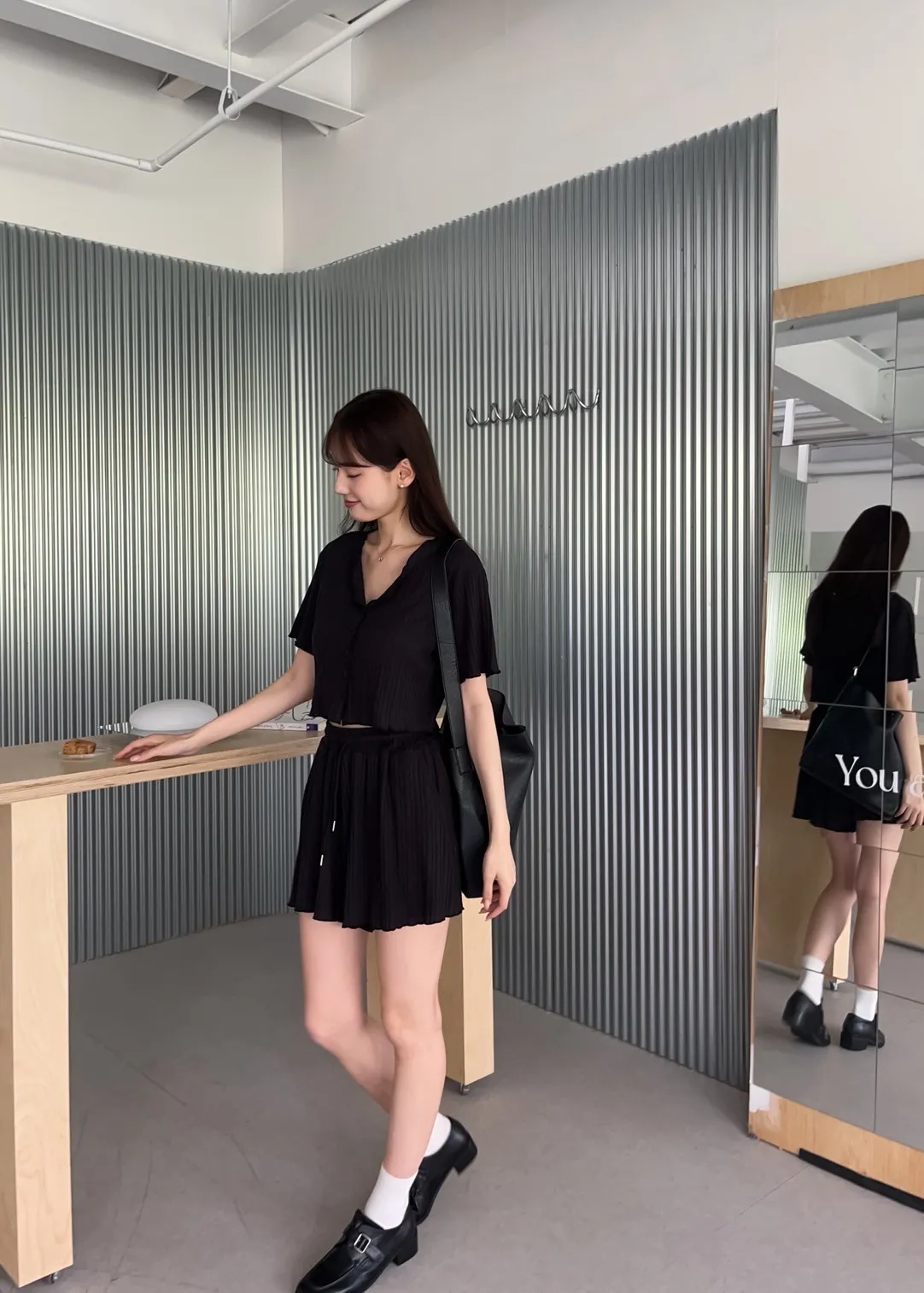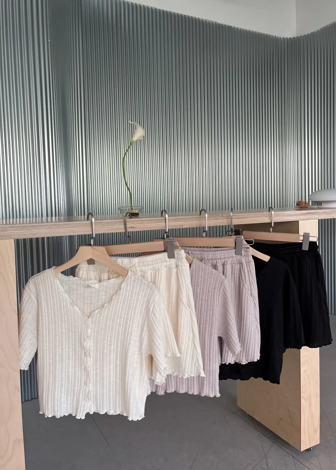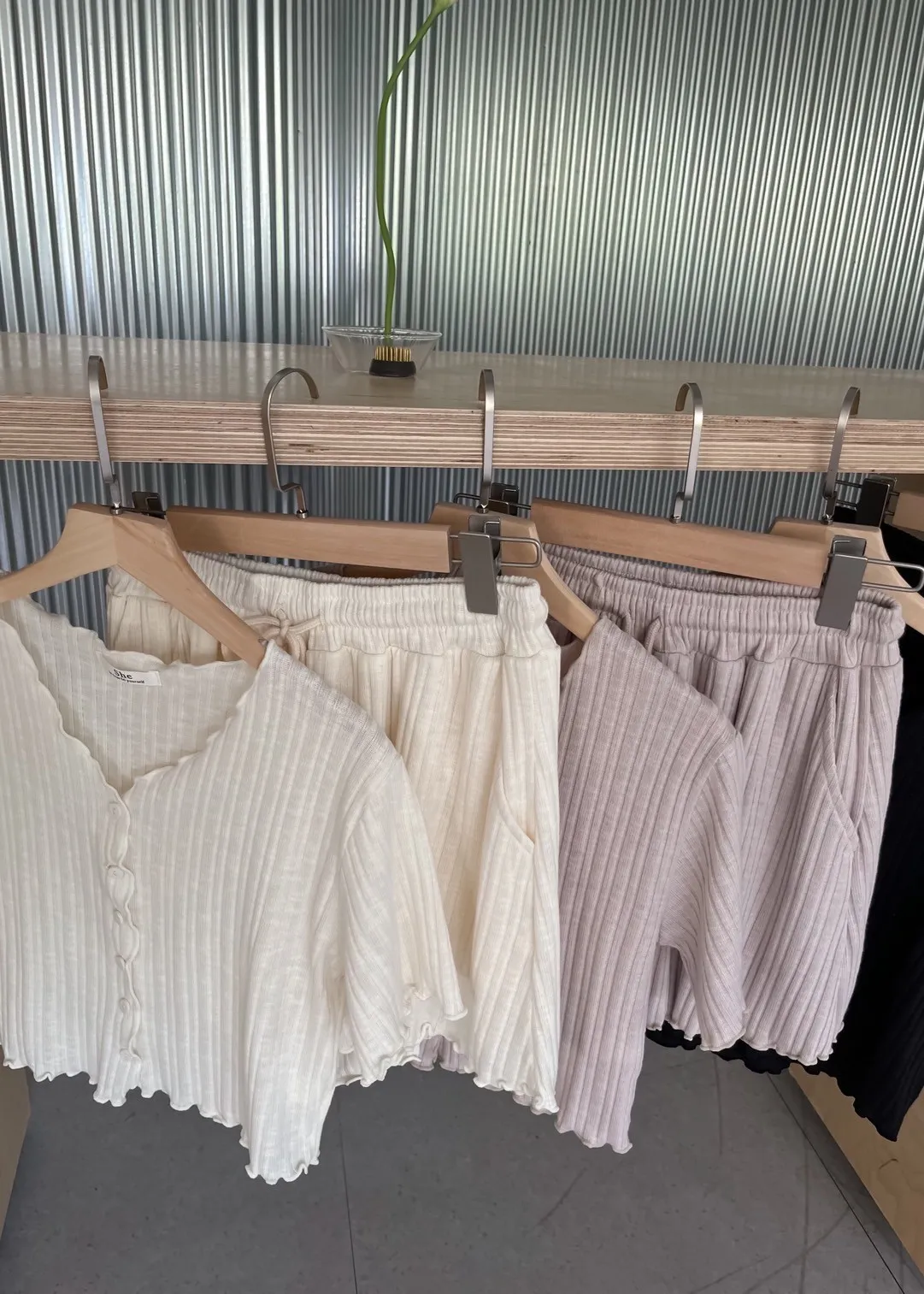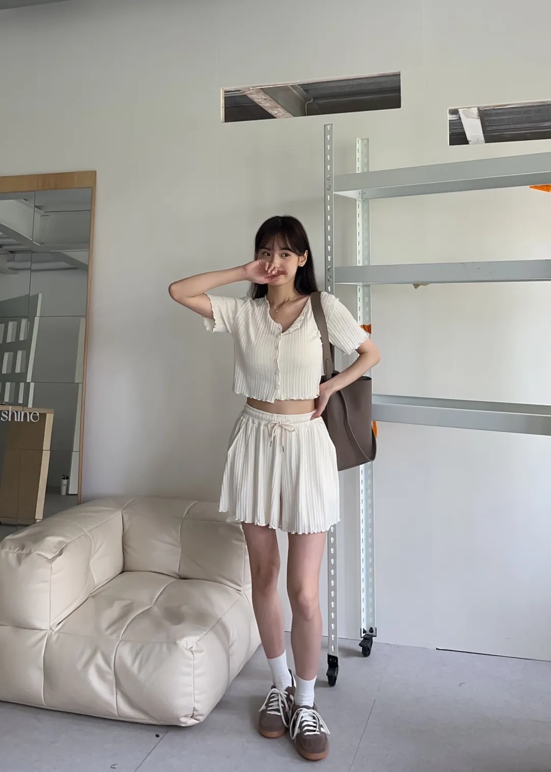 sm1504(She made)浪漫捲邊排扣上衣+捲邊短褲(米/藕粉/黑)(售完不補)