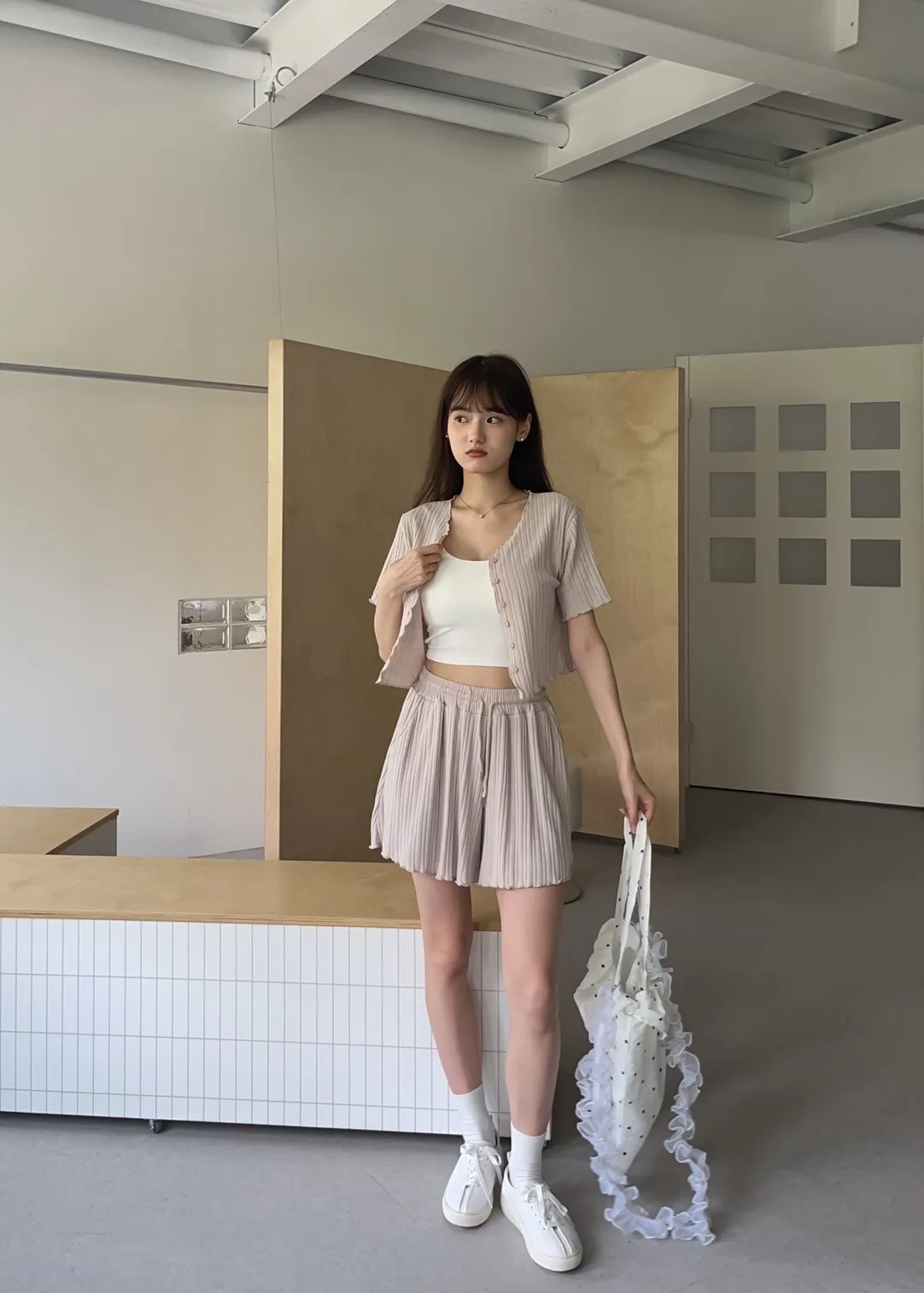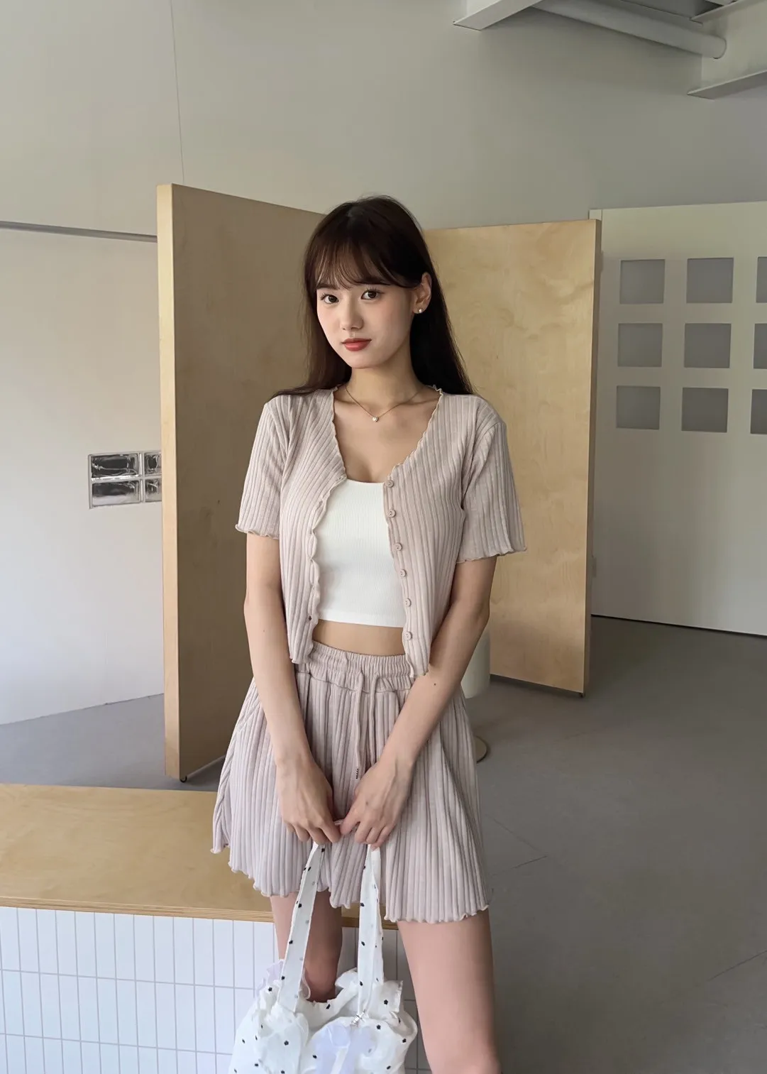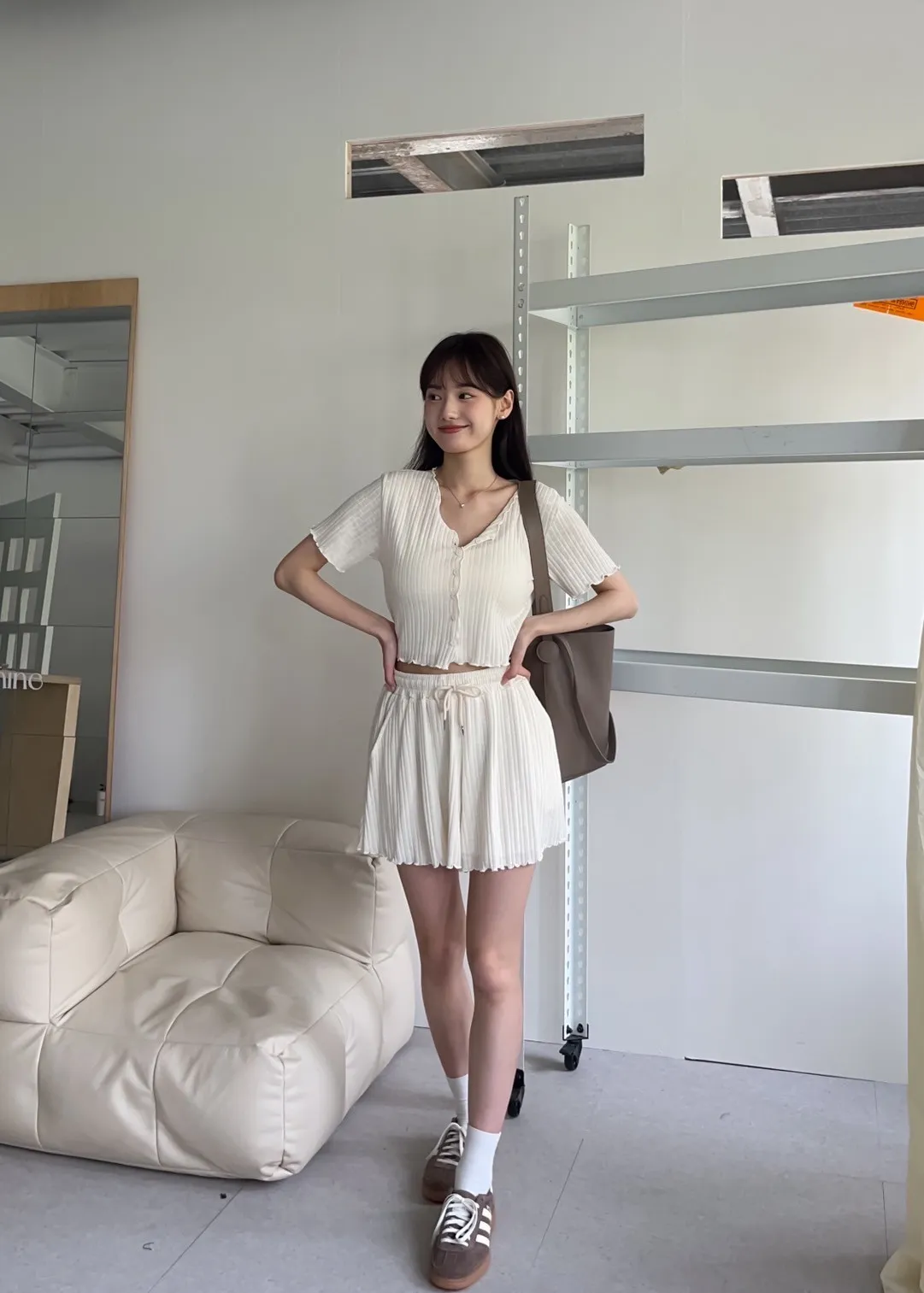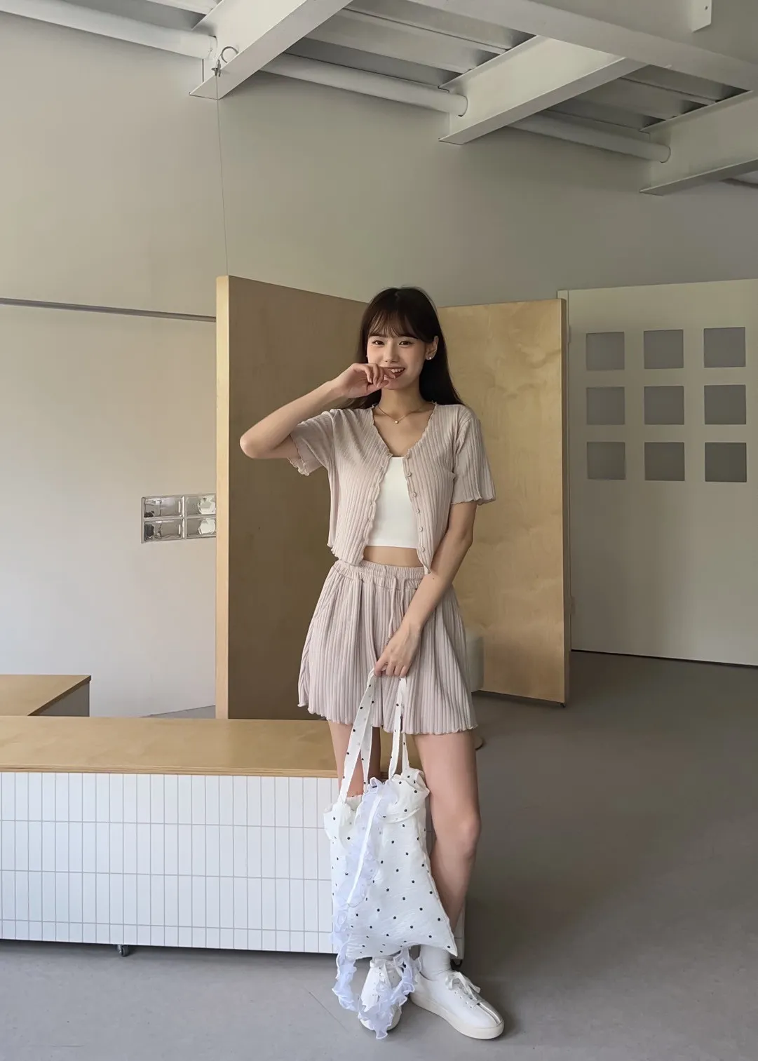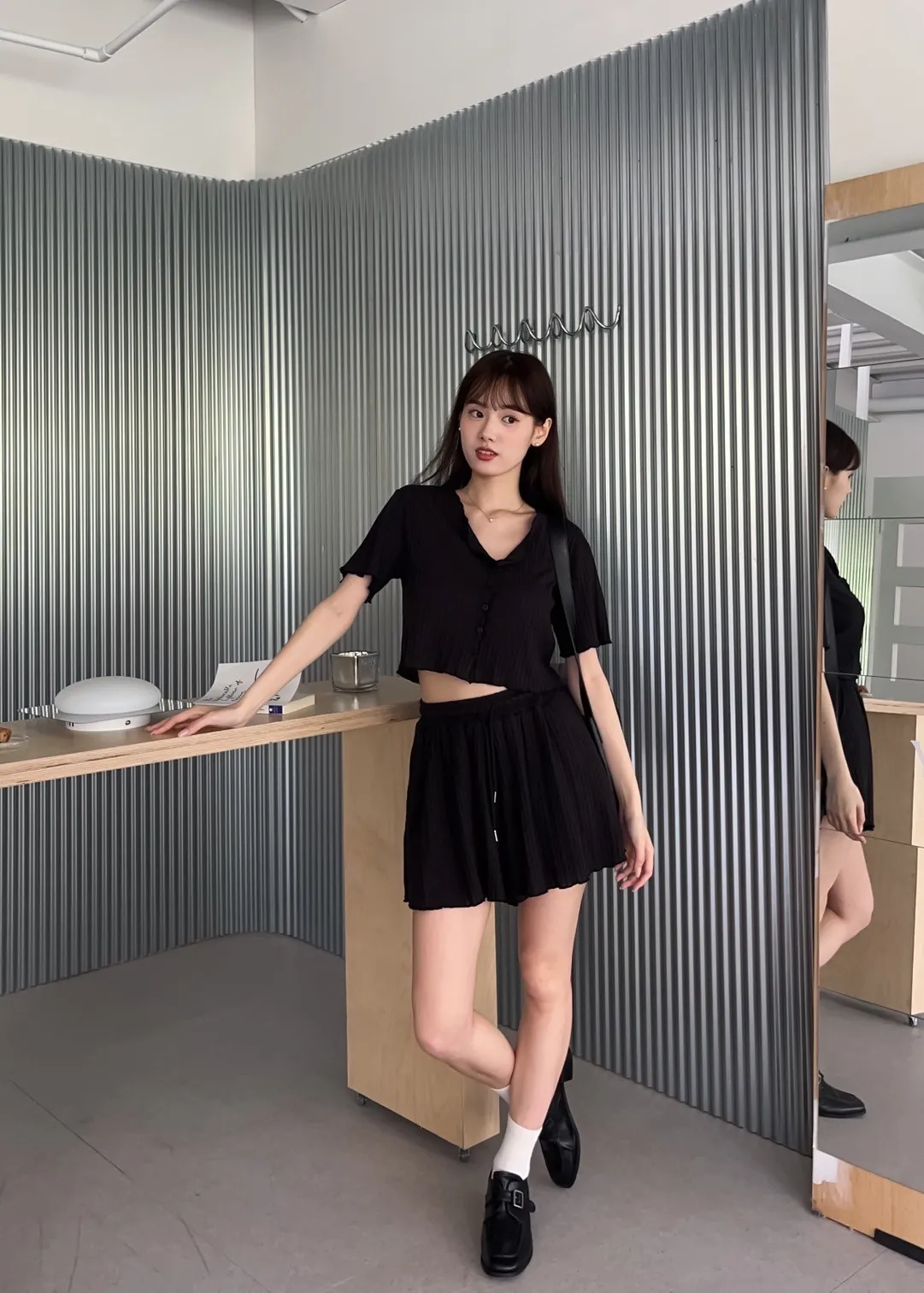sm1504(She made)浪漫捲邊排扣上衣+捲邊短褲(米/藕粉/黑)(售完不補)