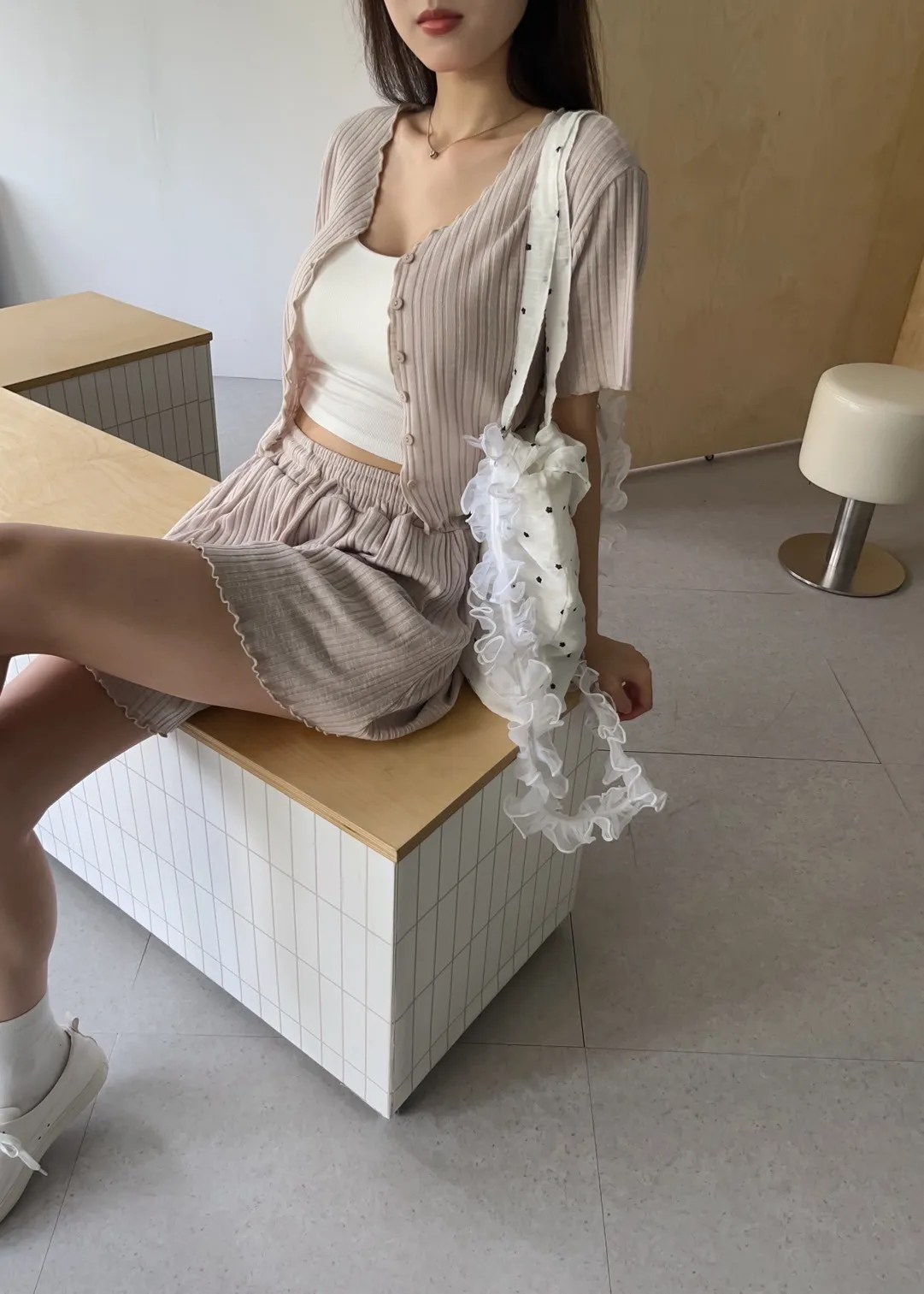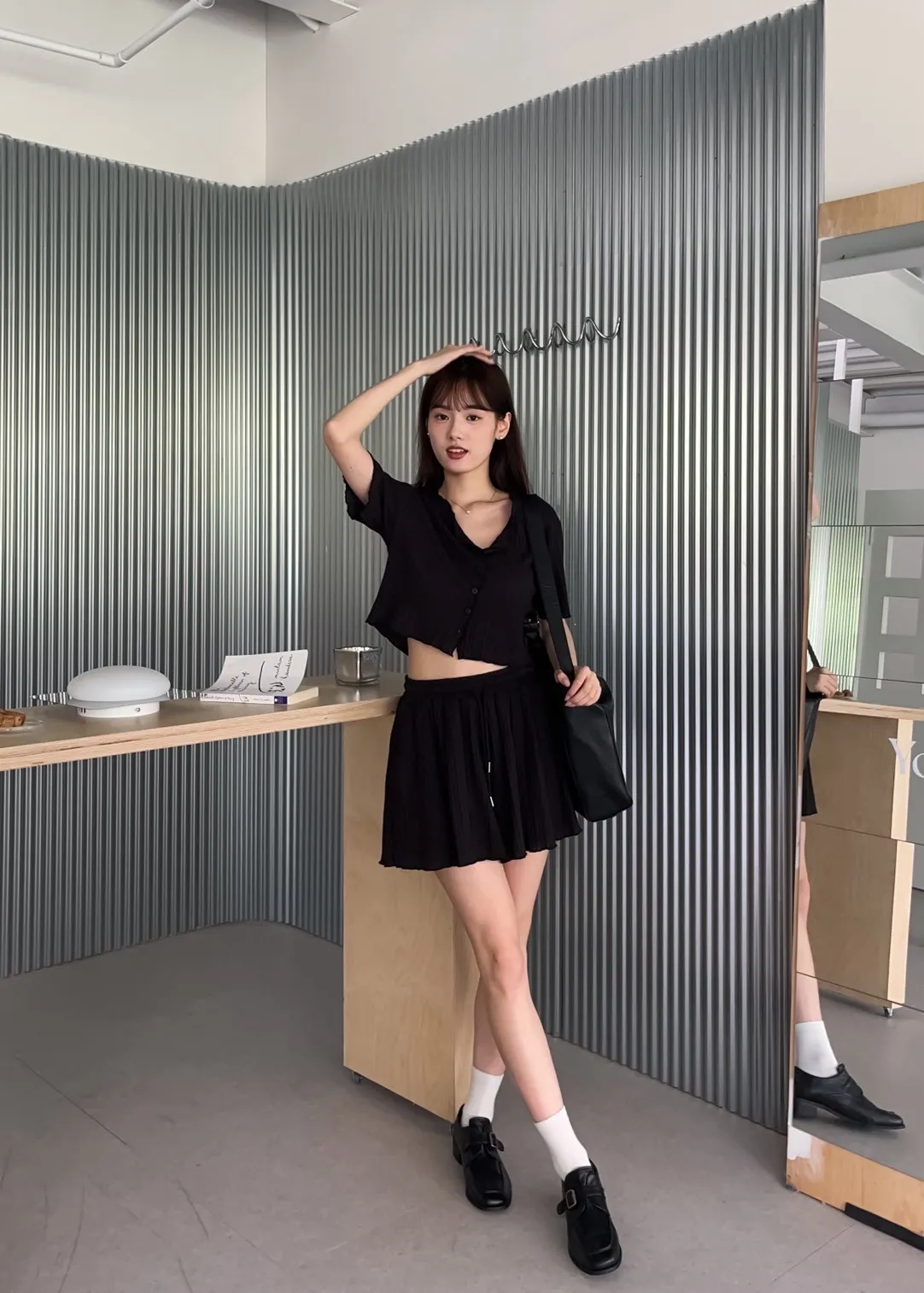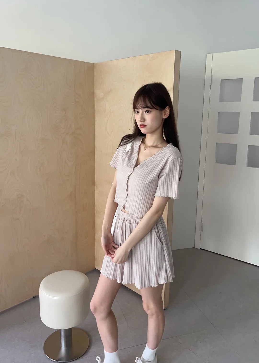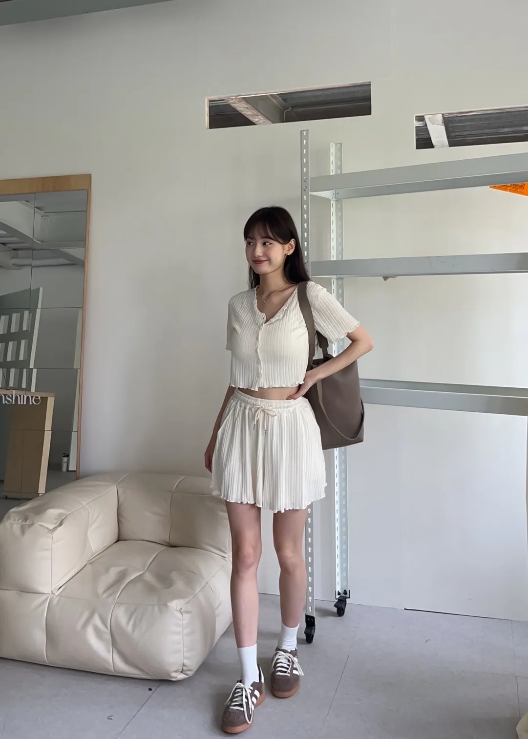sm1504(She made)浪漫捲邊排扣上衣+捲邊短褲(米/藕粉/黑)(售完不補)