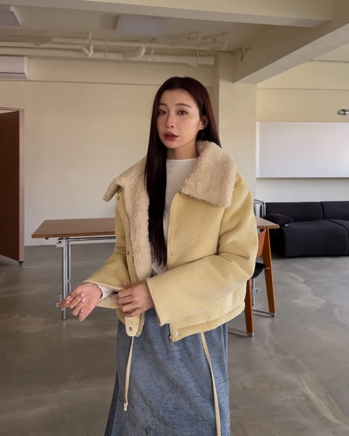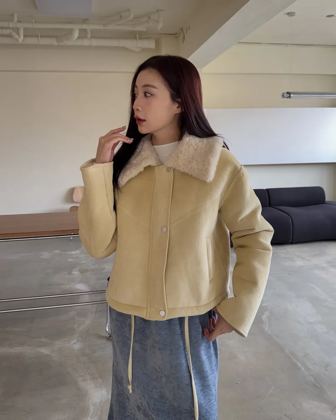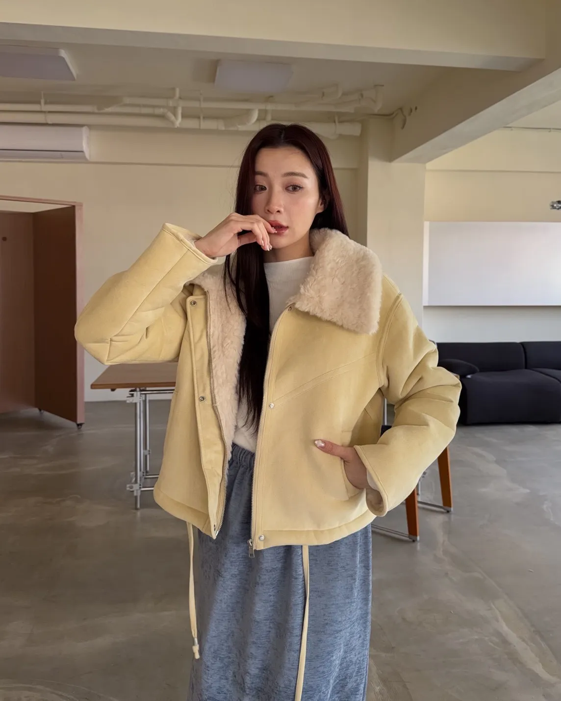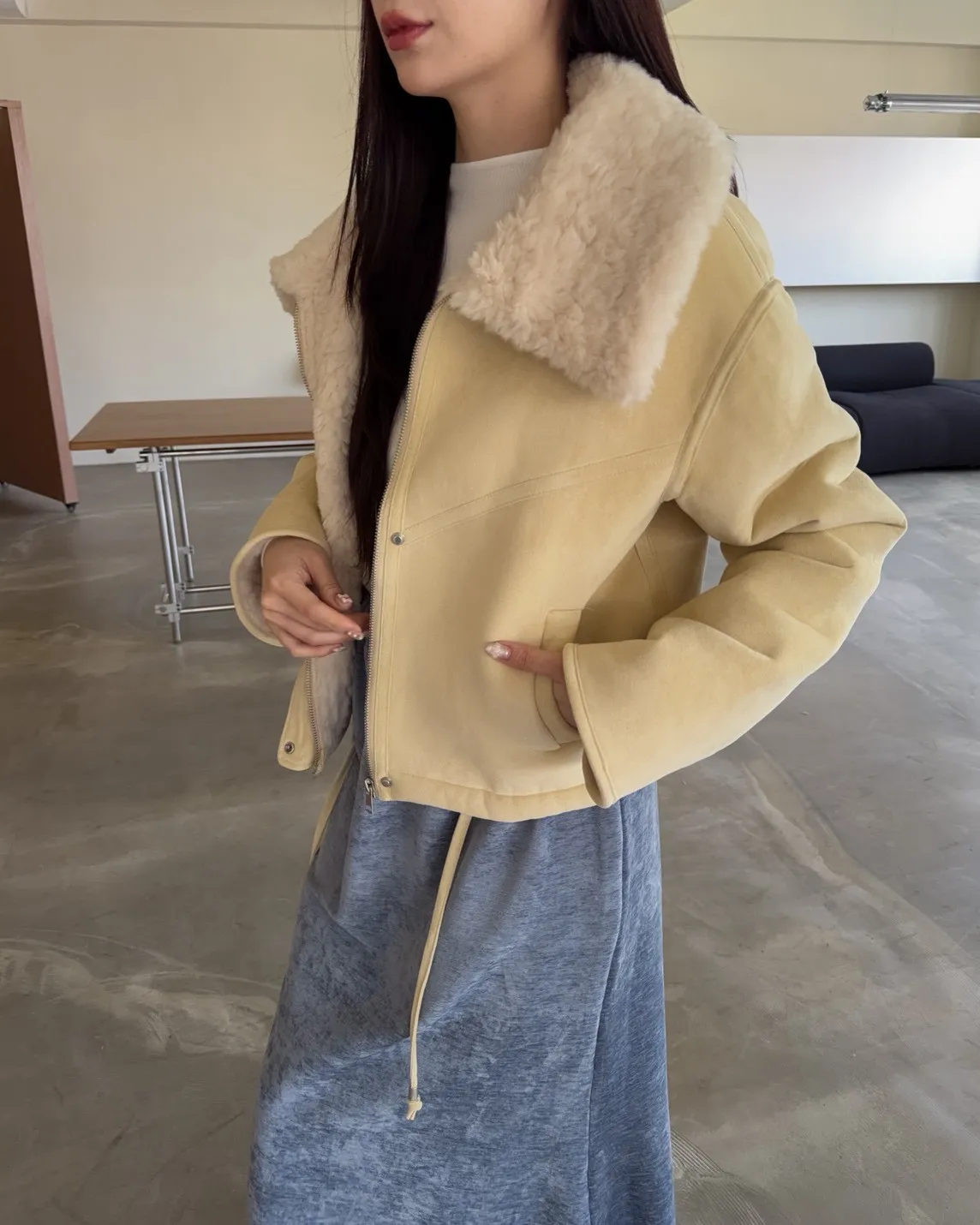 超級暖鋪毛 翻領 叮叮扣+拉鍊 兩側口袋 麂皮 下擺抽繩可縮緊