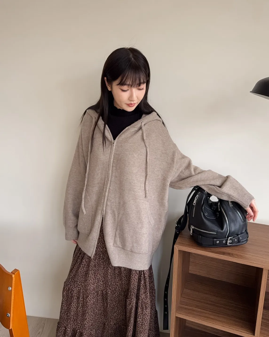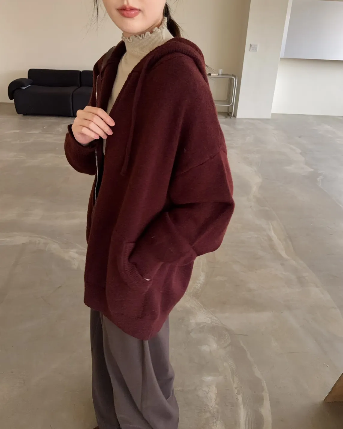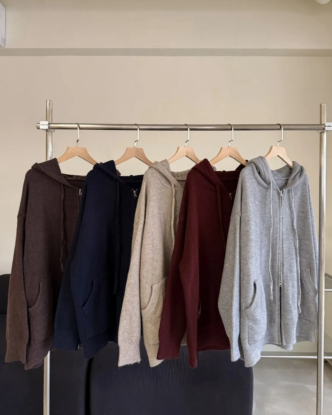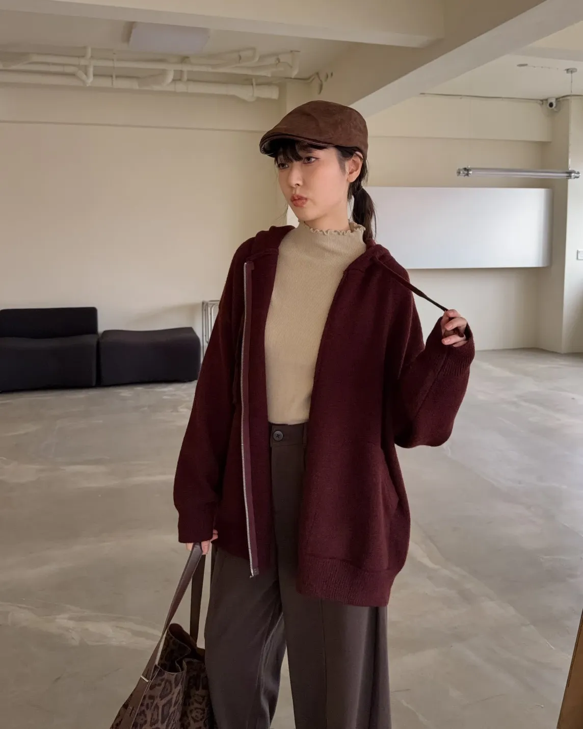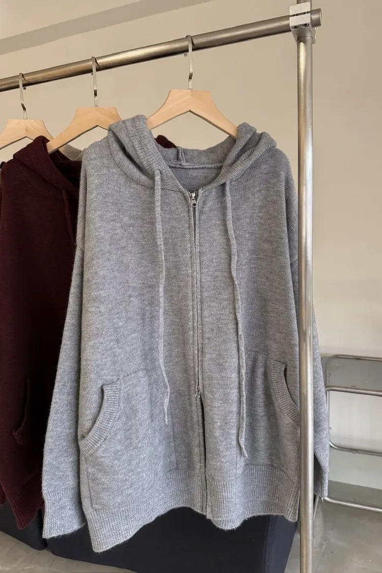 Y0007(五色)慵懶感雙拉鍊連帽針織外套(灰/可可/紅/咖啡/深藍)