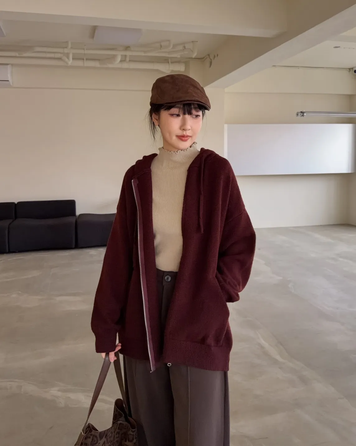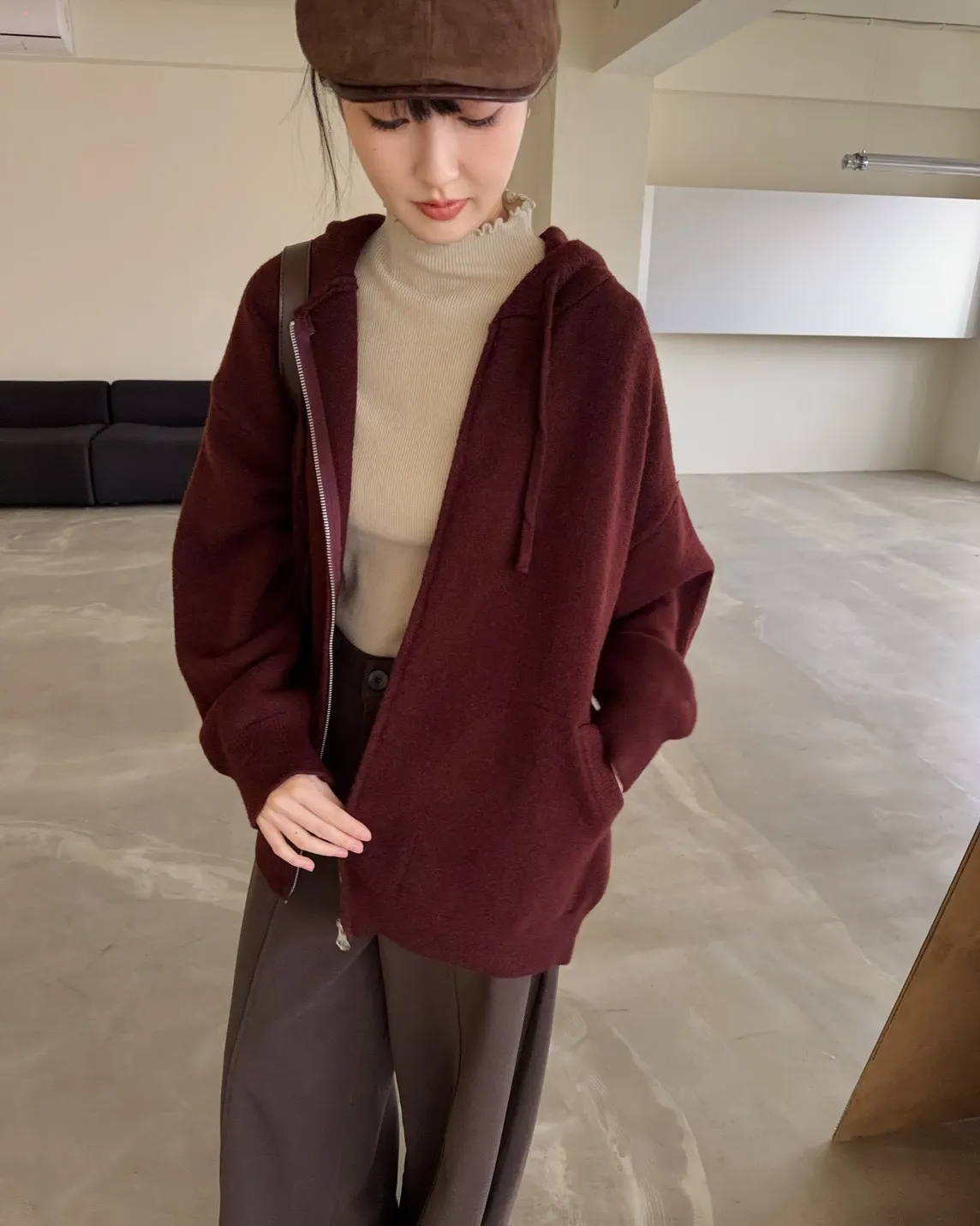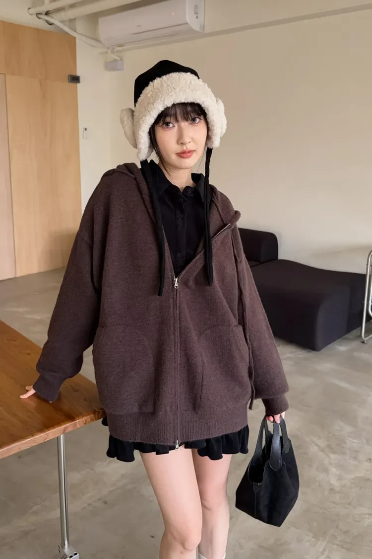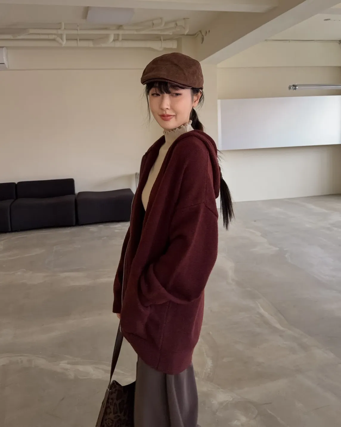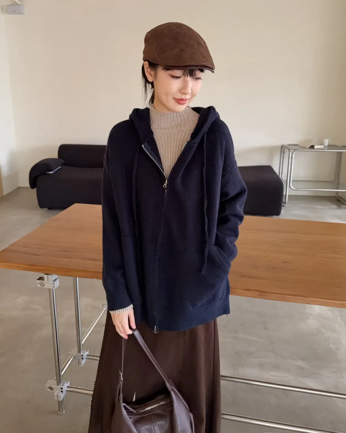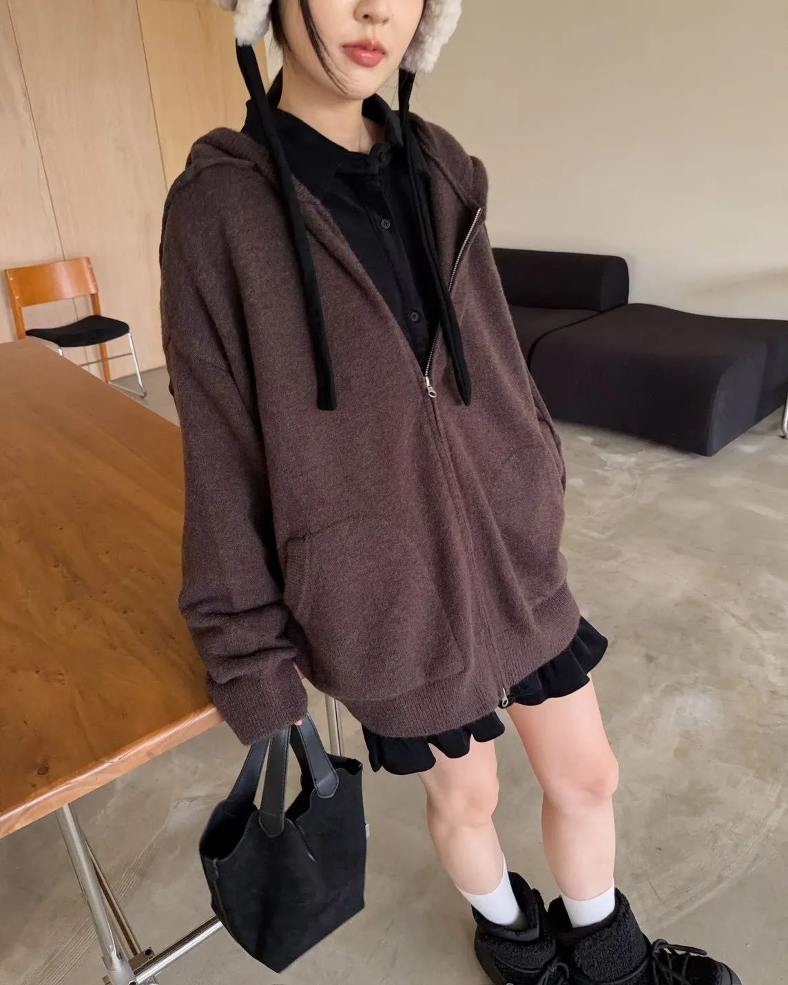 Y0007(五色)慵懶感雙拉鍊連帽針織外套(灰/可可/紅/咖啡/深藍)
