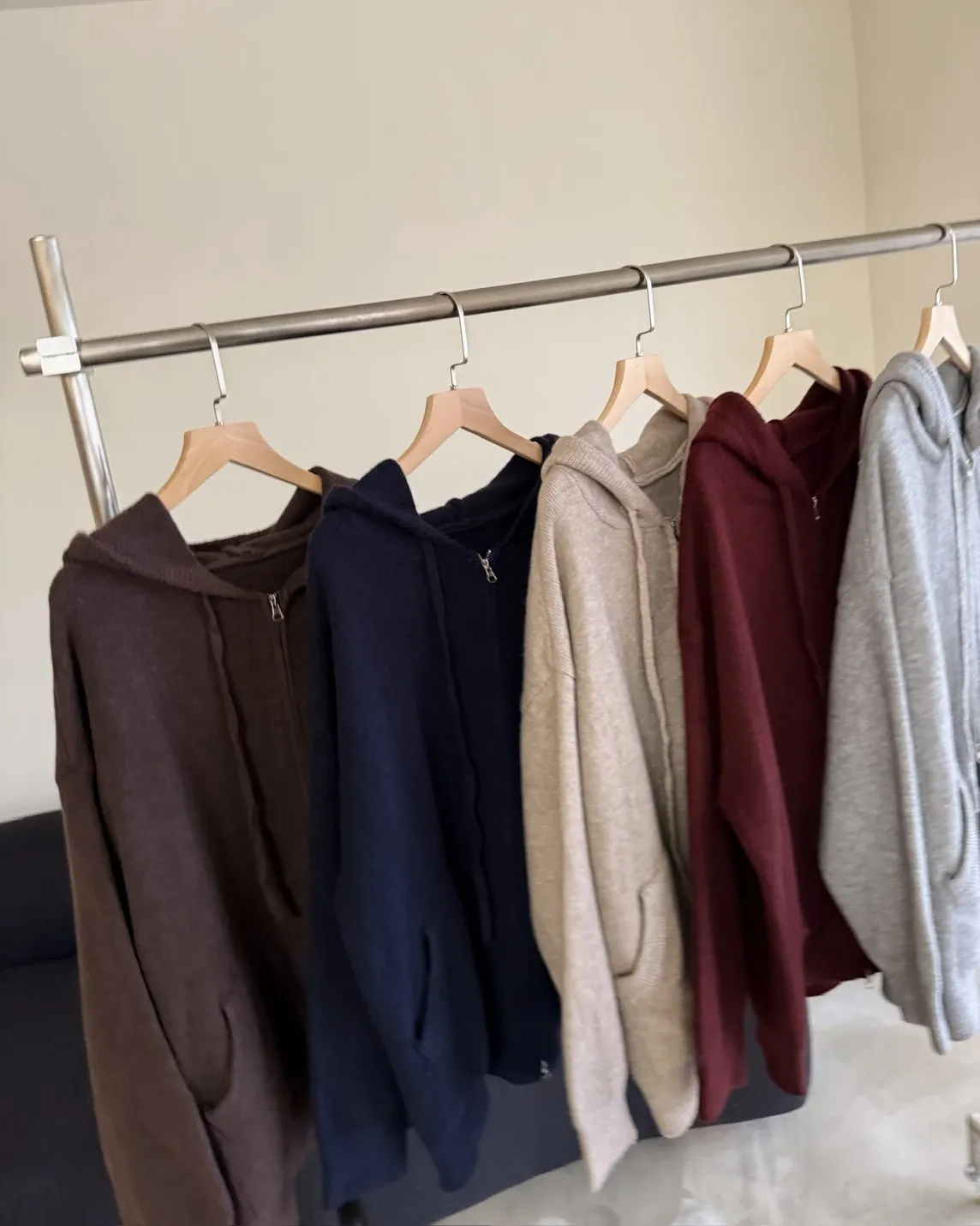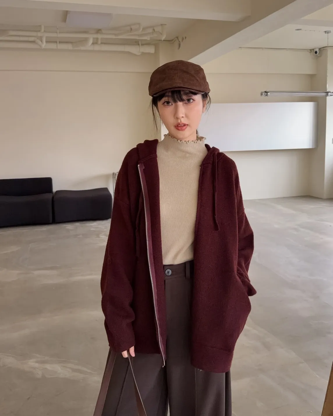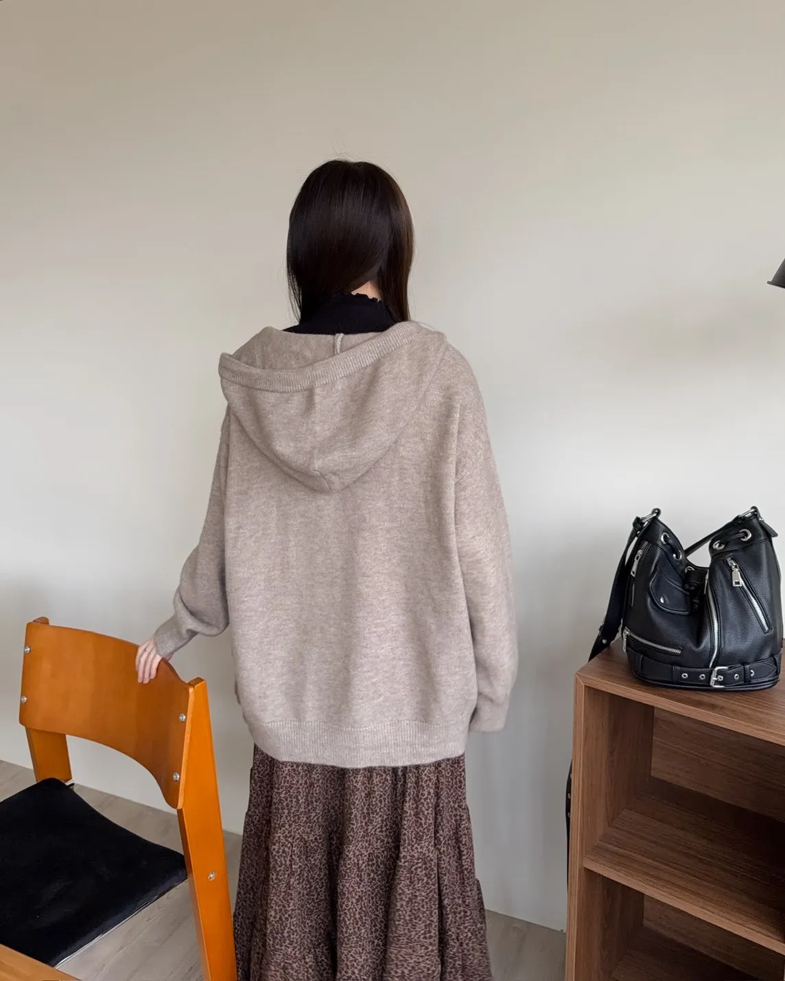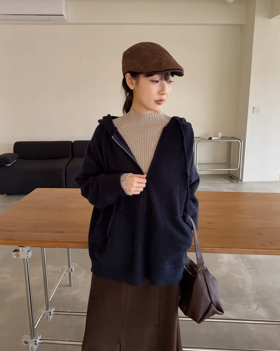 Y0007(五色)慵懶感雙拉鍊連帽針織外套(灰/可可/紅/咖啡/深藍)