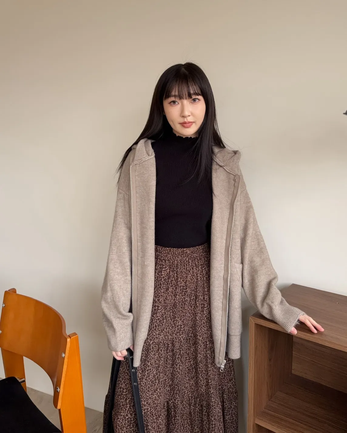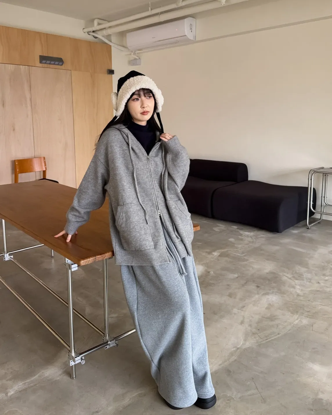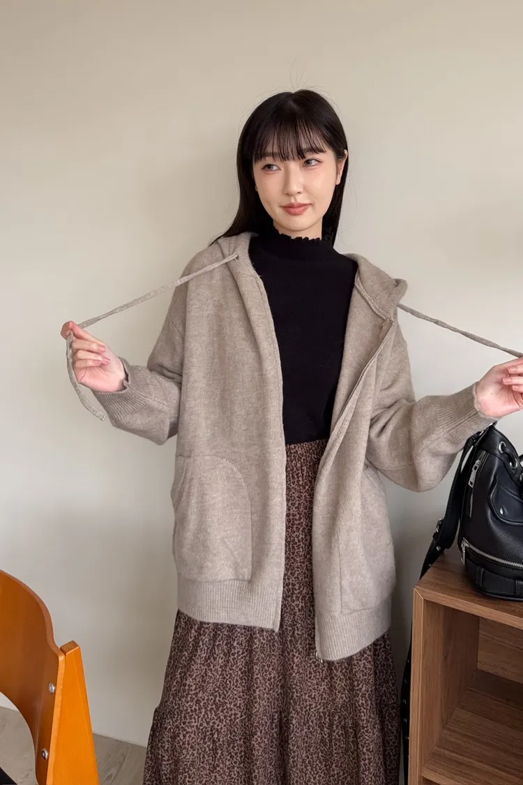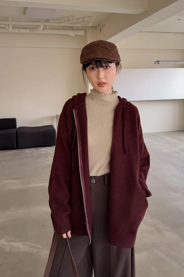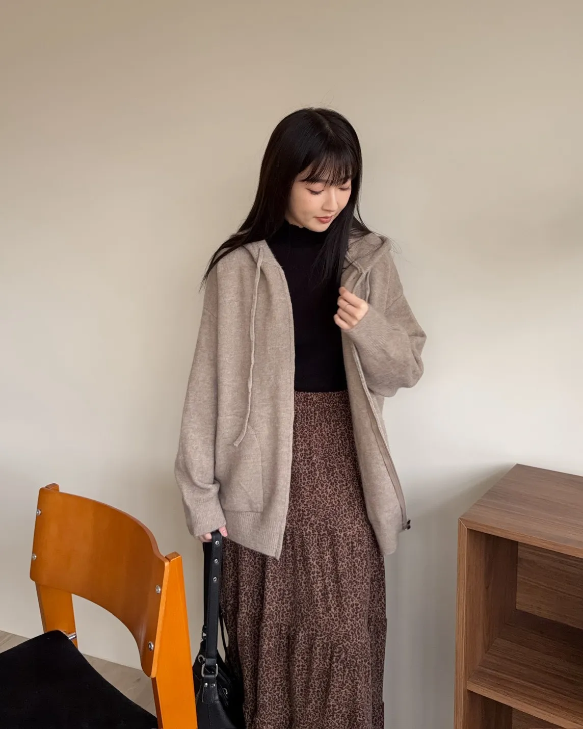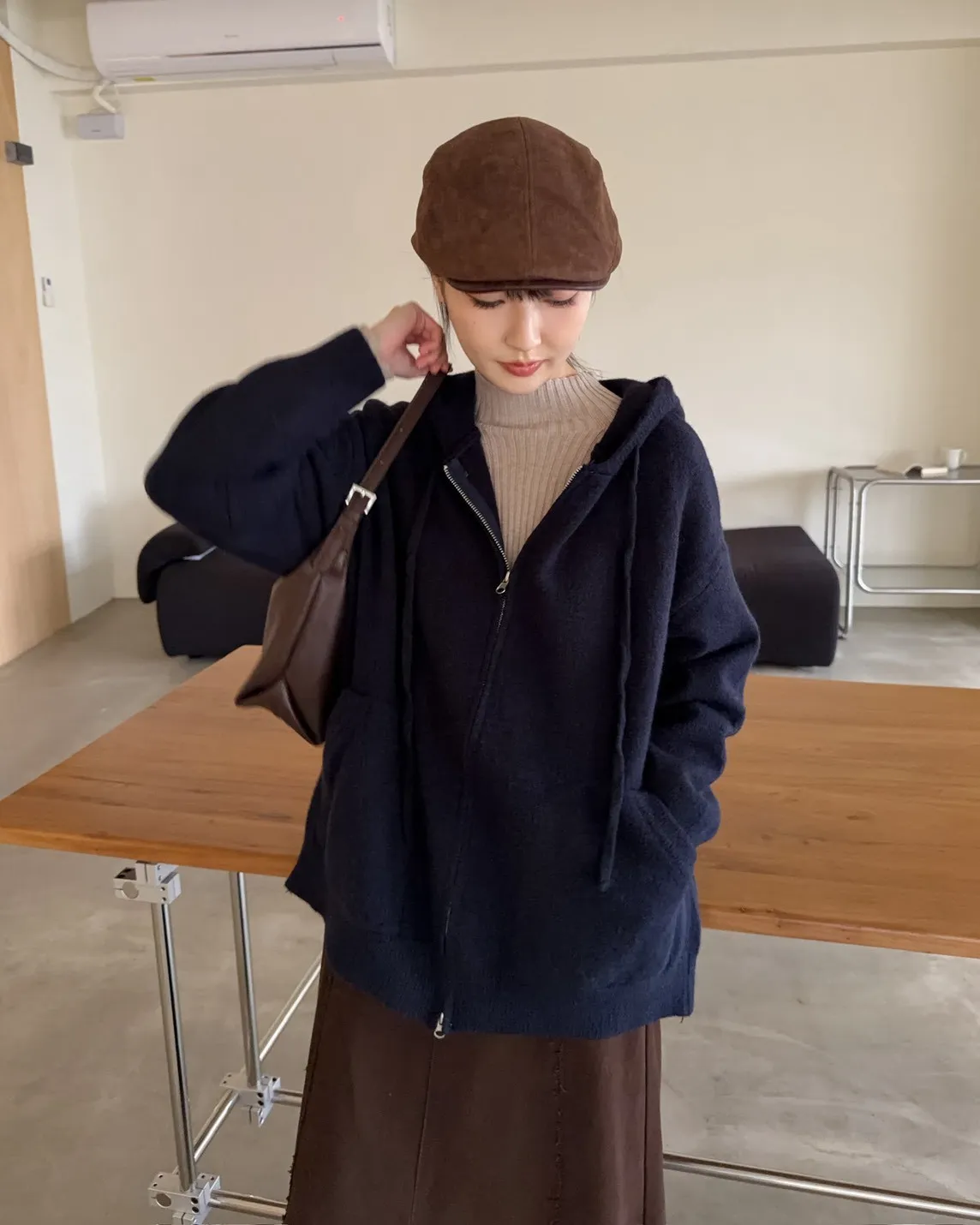 Y0007(五色)慵懶感雙拉鍊連帽針織外套(灰/可可/紅/咖啡/深藍)