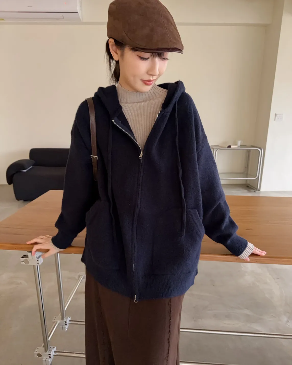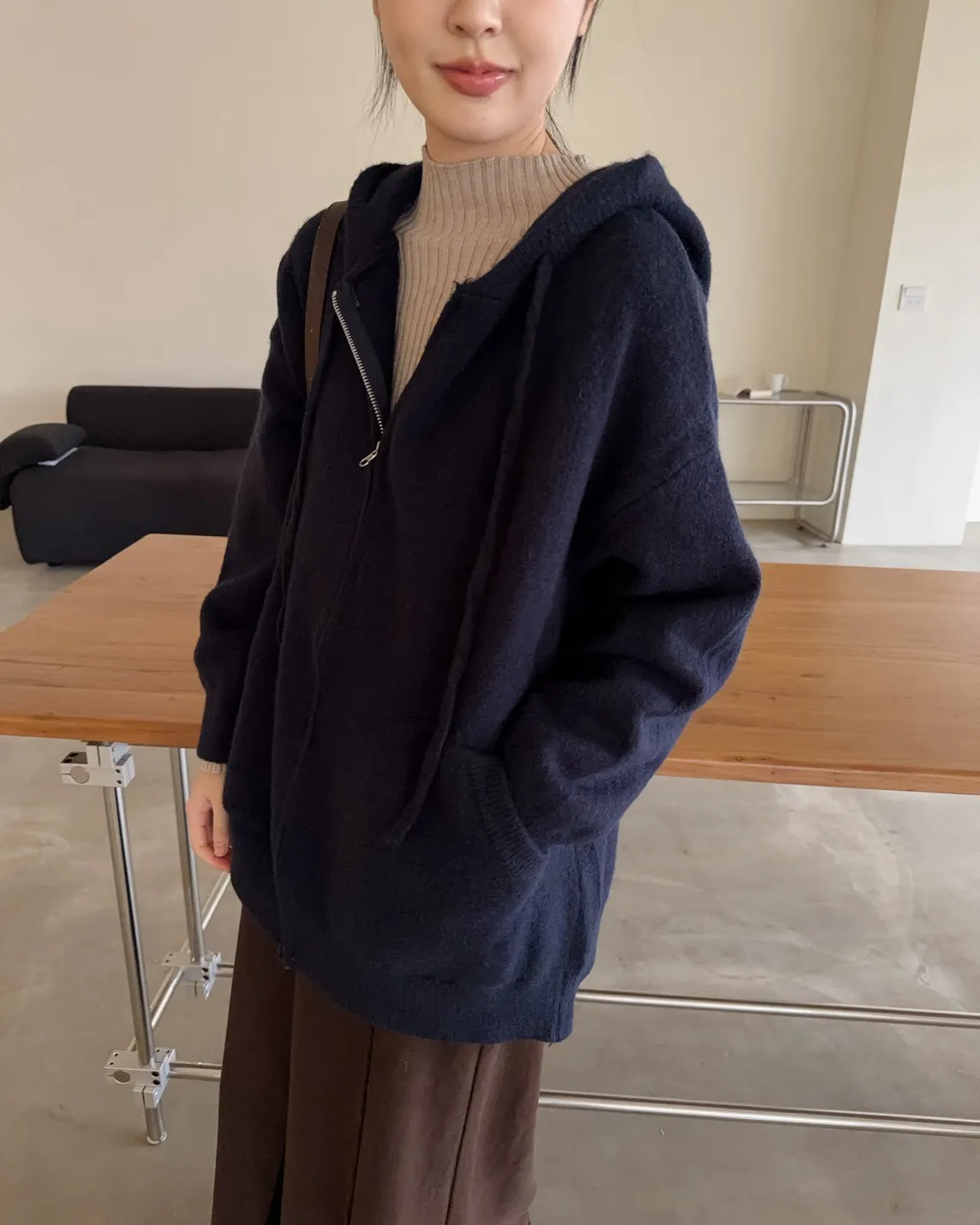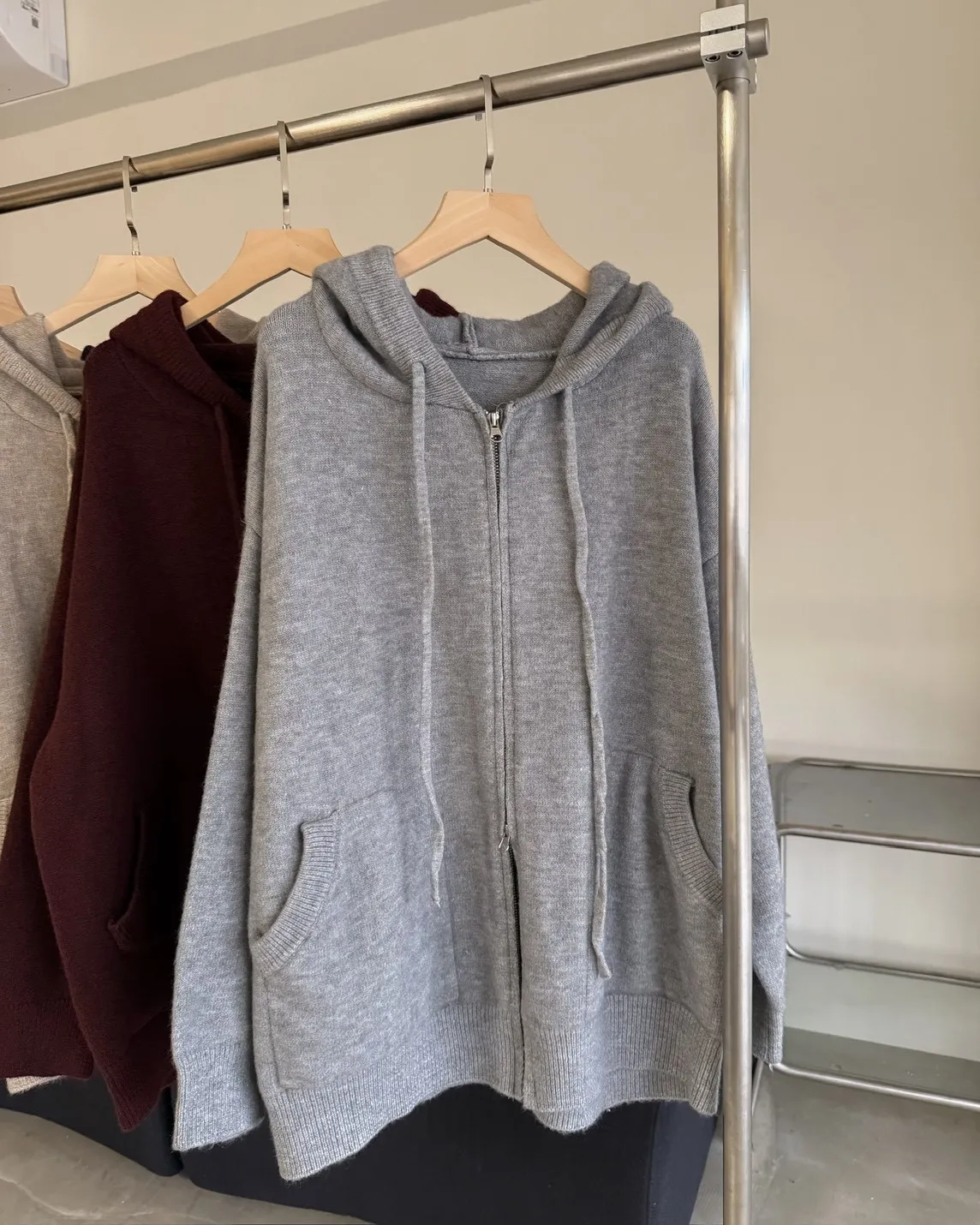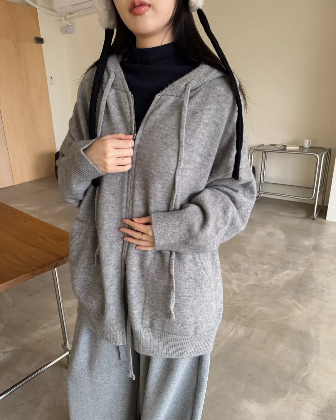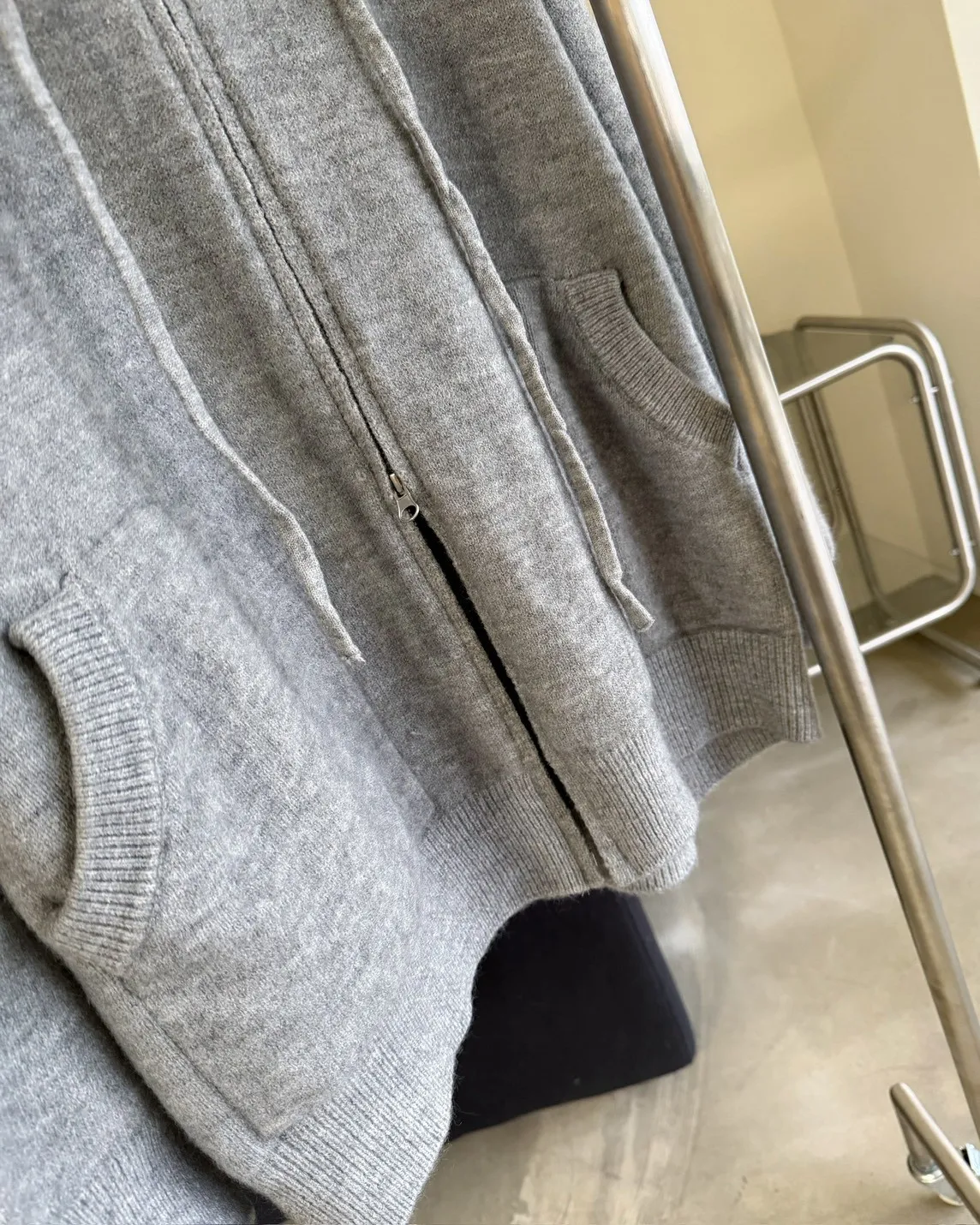 雙拉鍊 寬鬆落肩 兩邊口袋 連帽 針織