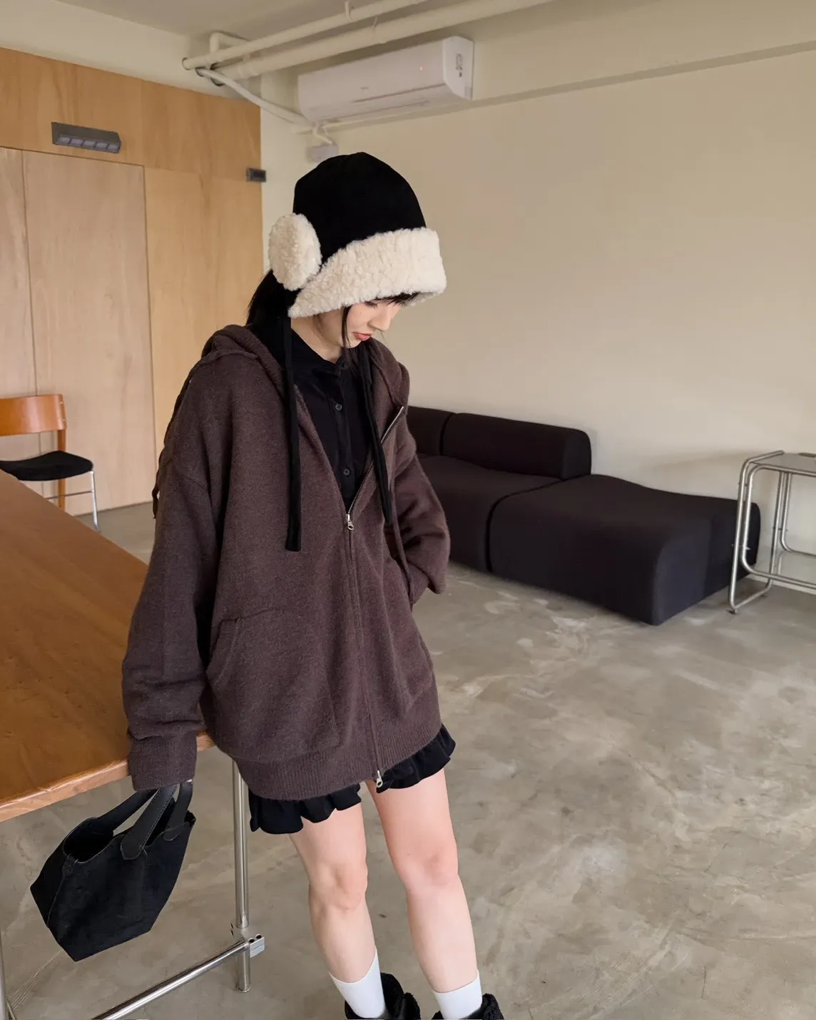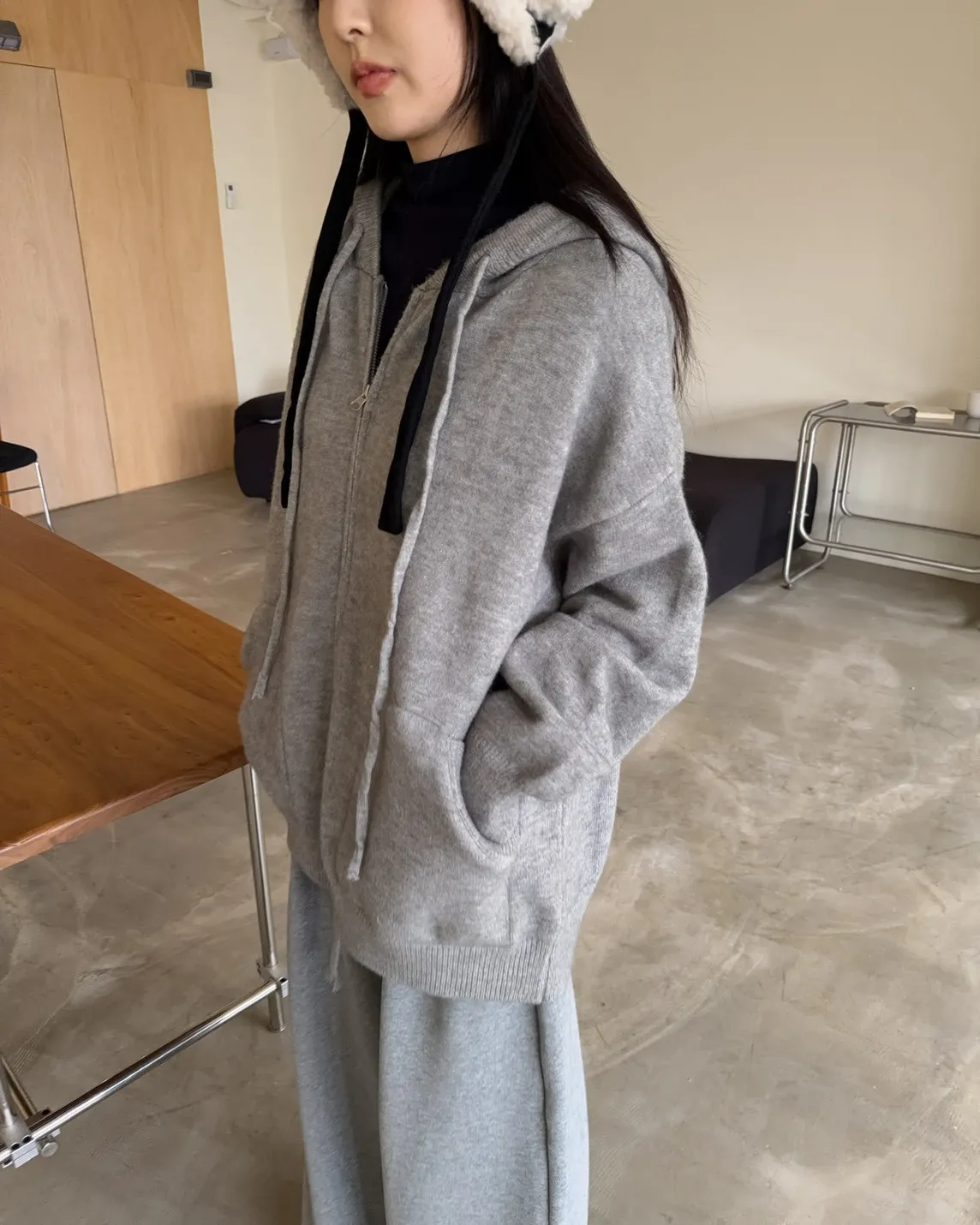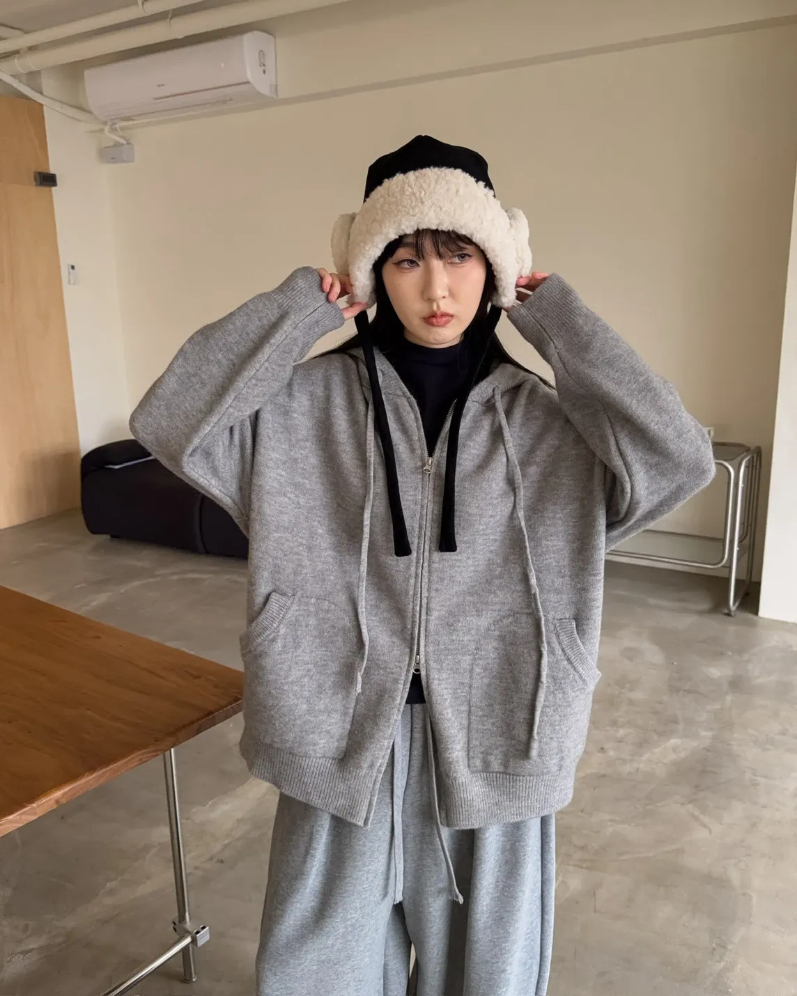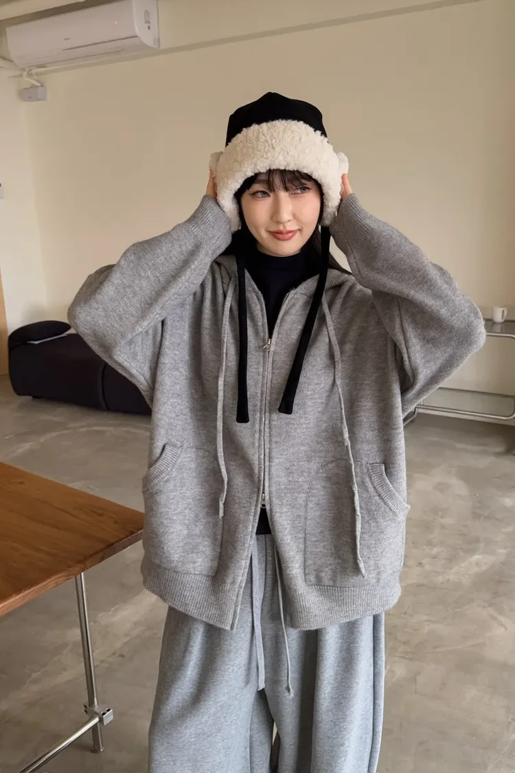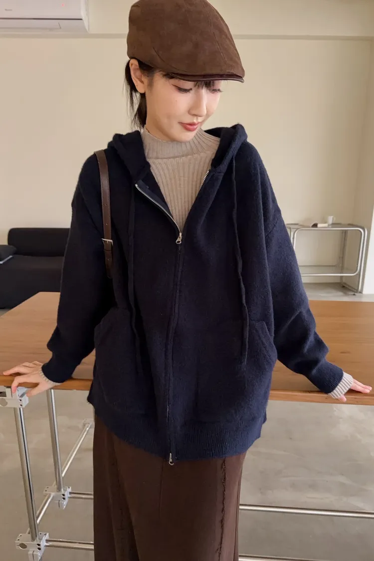 雙拉鍊 寬鬆落肩 兩邊口袋 連帽 針織