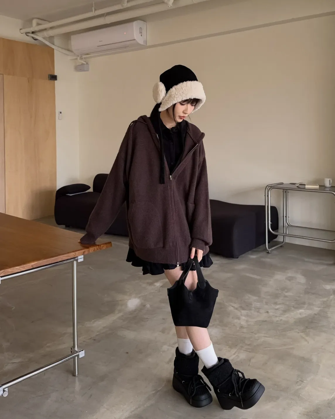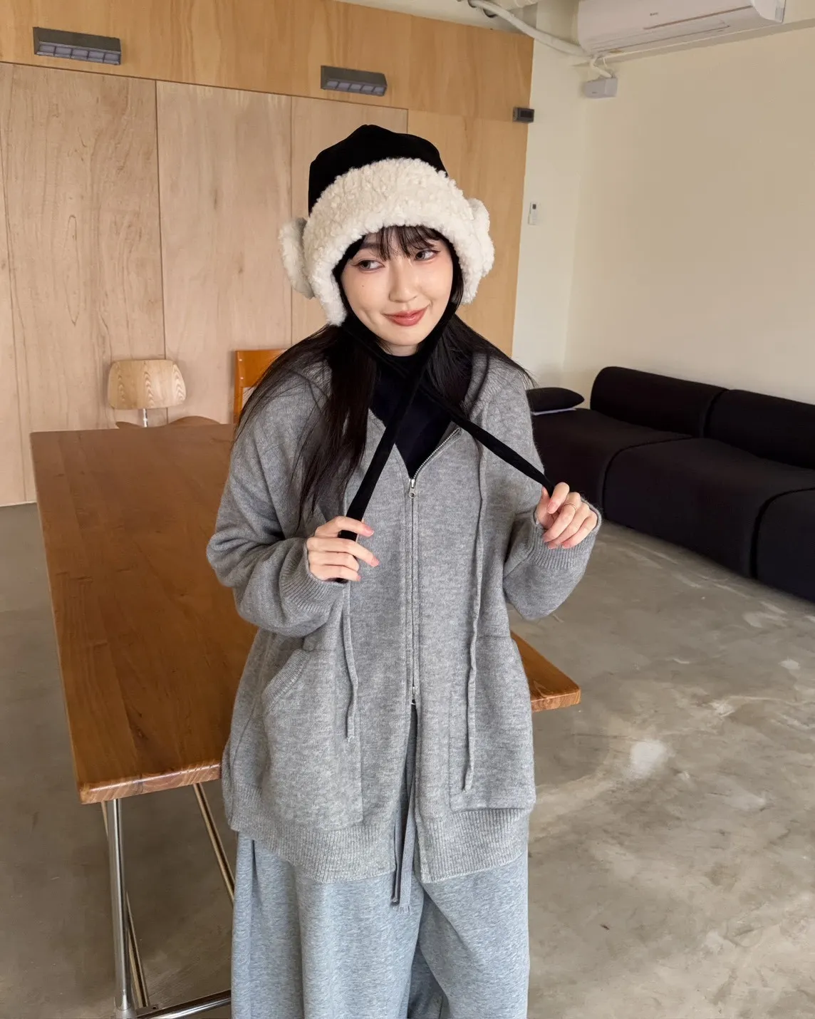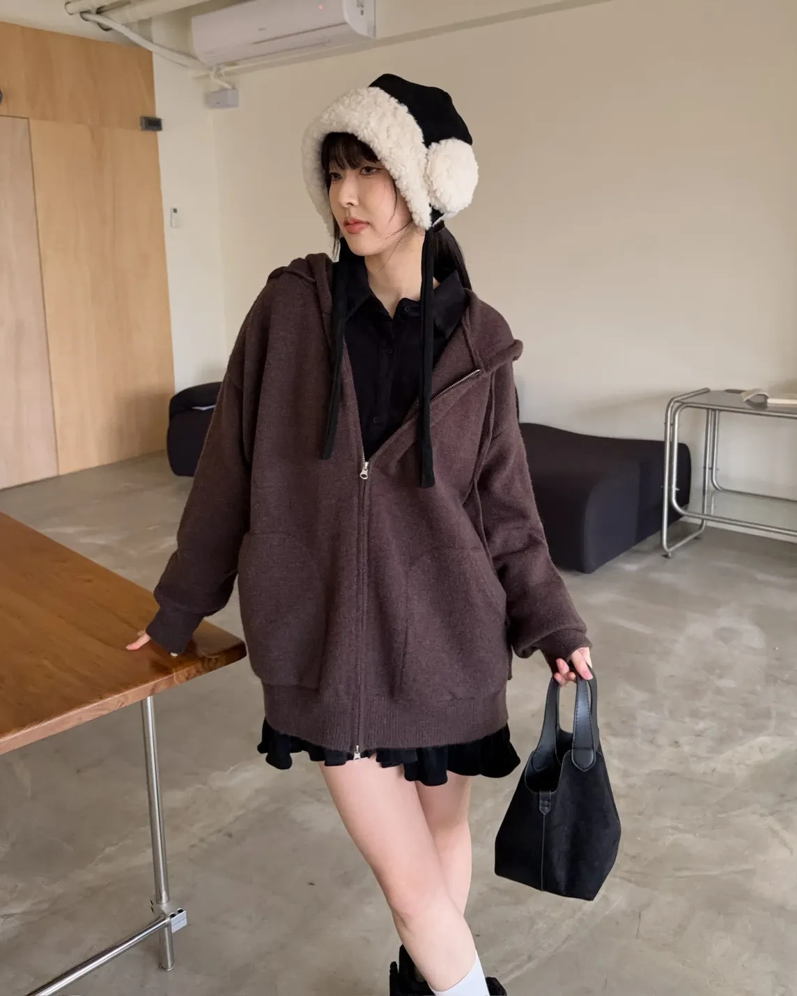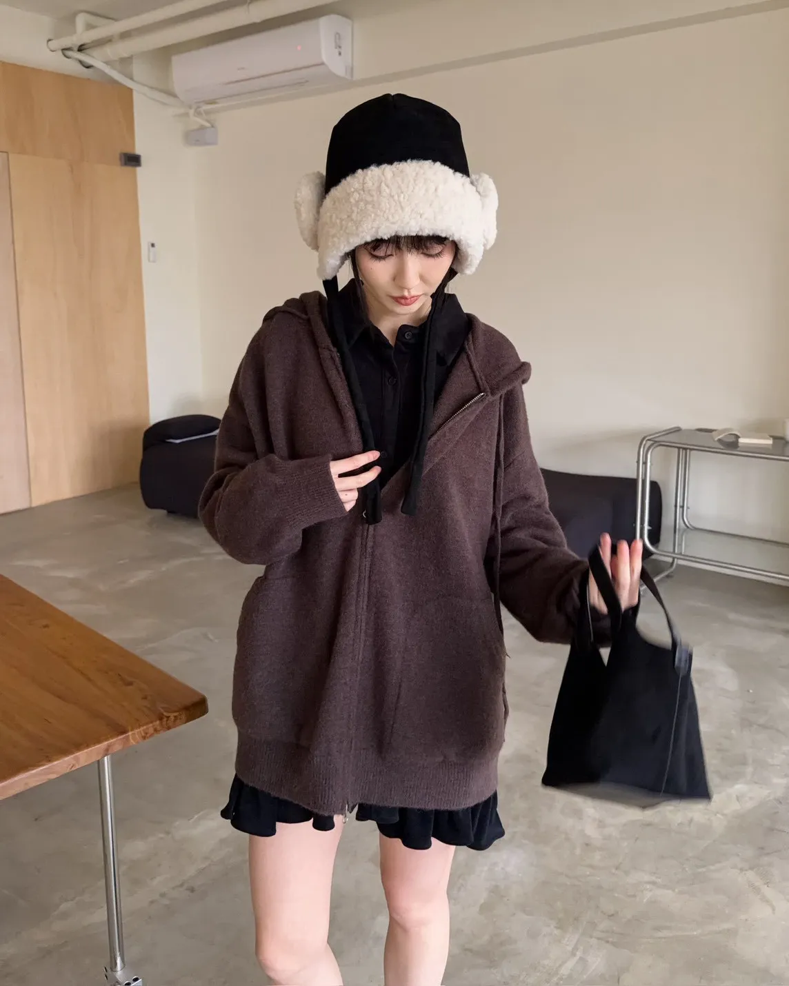 雙拉鍊 寬鬆落肩 兩邊口袋 連帽 針織