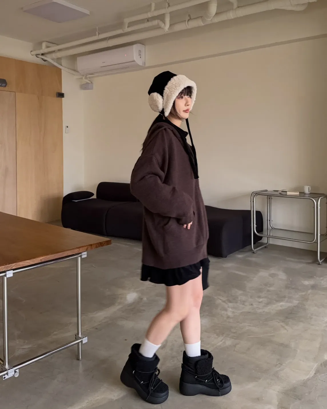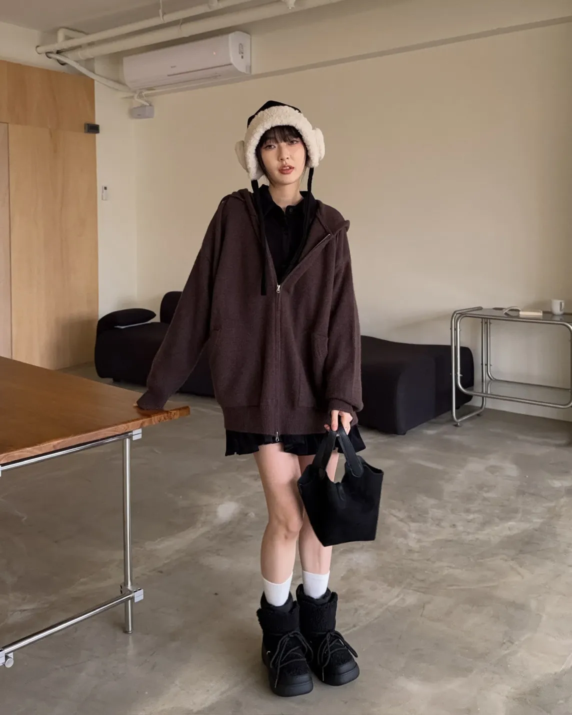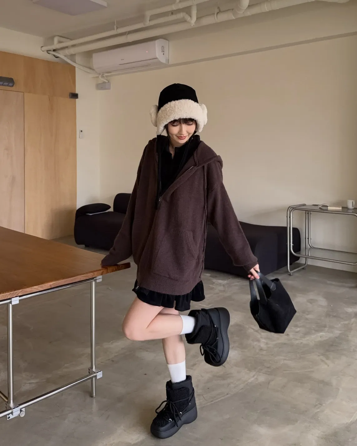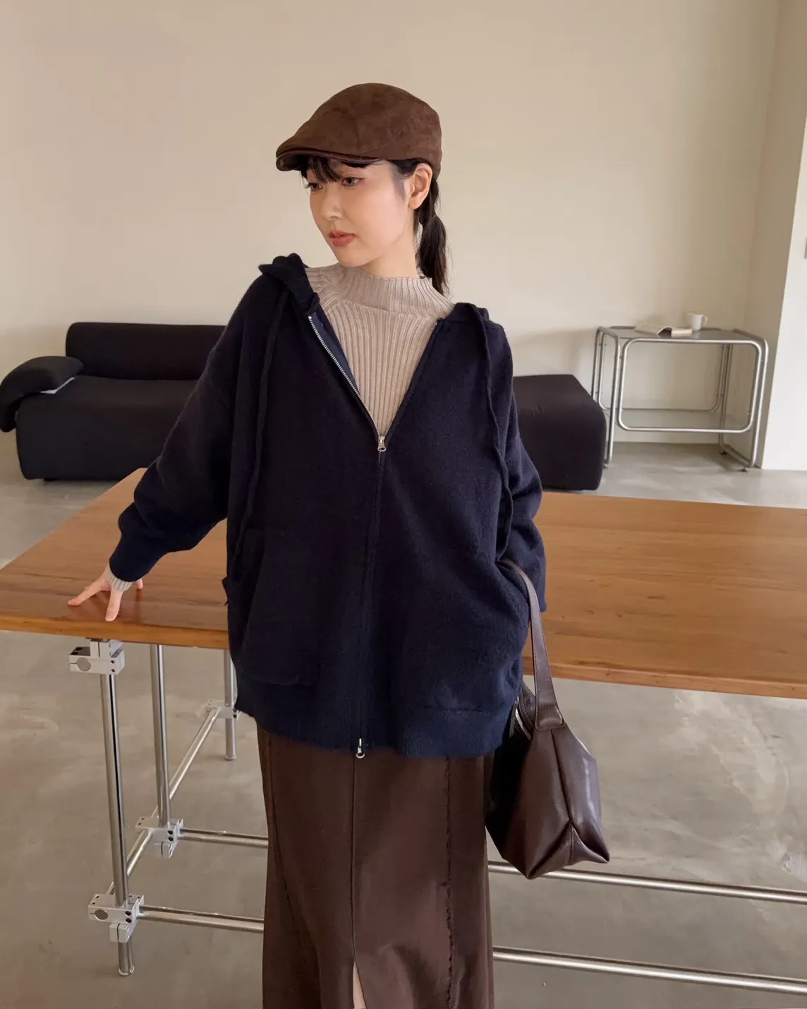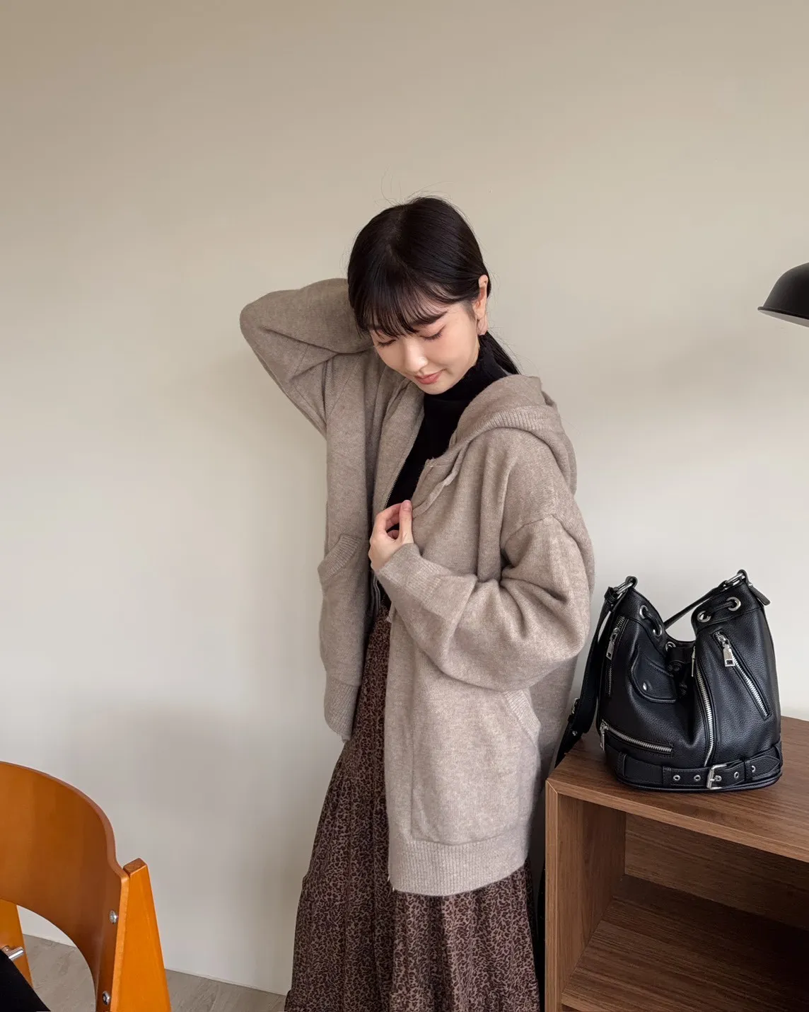 雙拉鍊 寬鬆落肩 兩邊口袋 連帽 針織