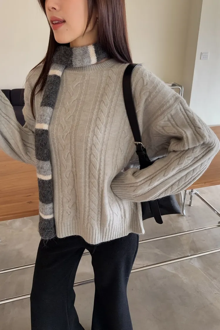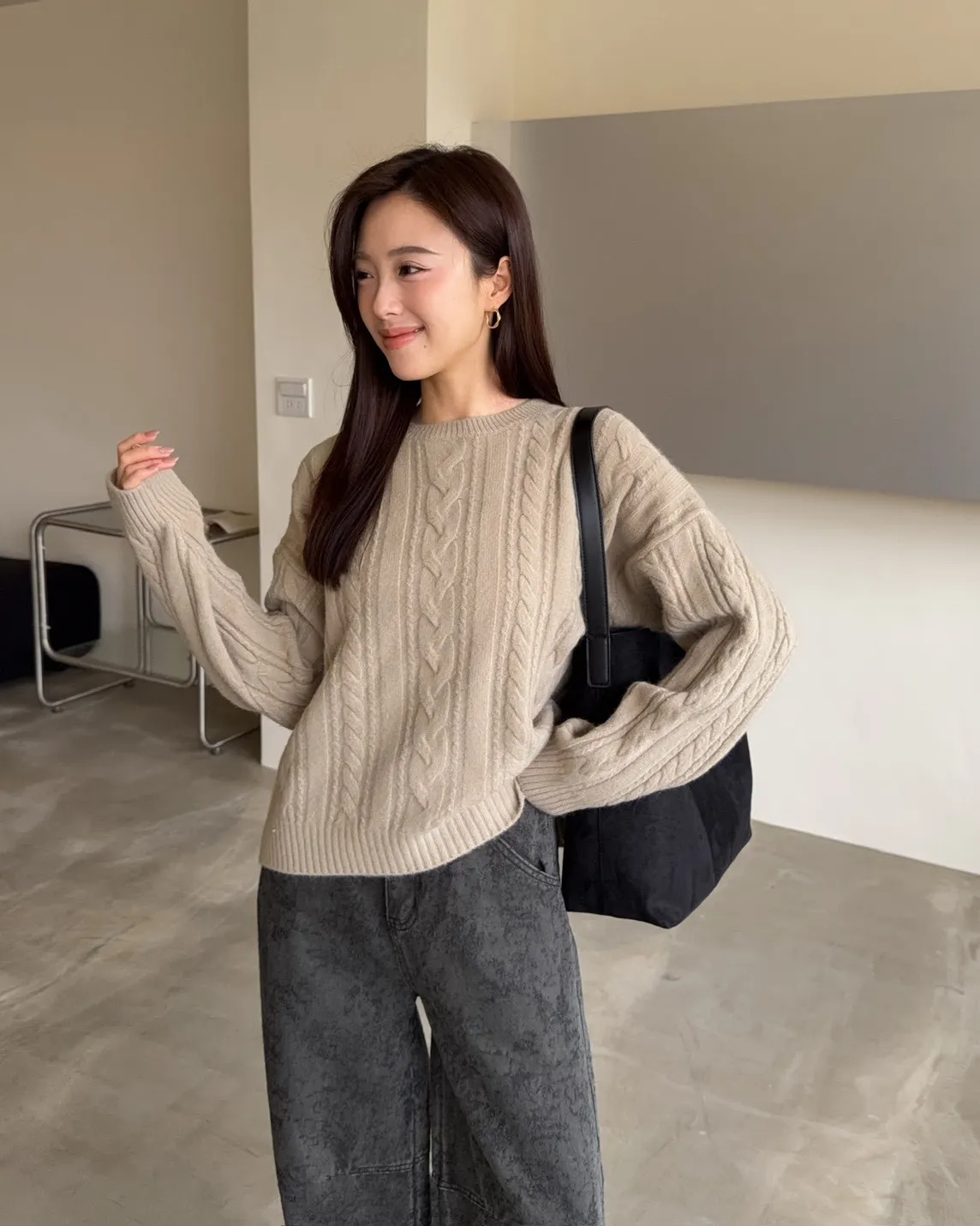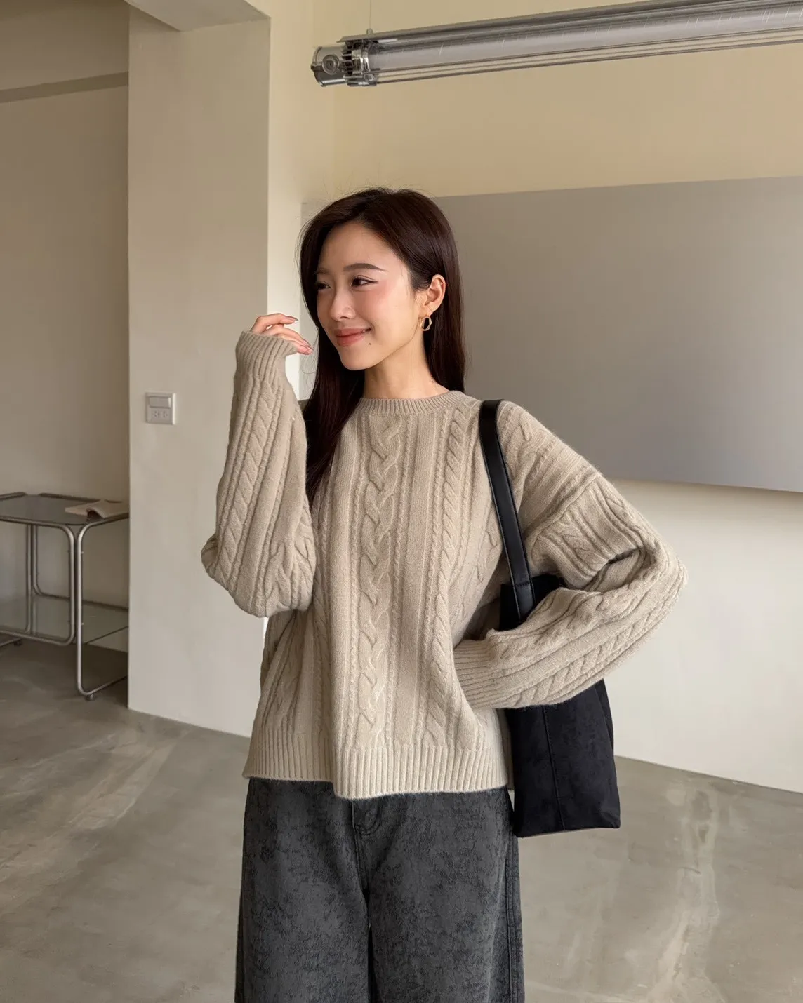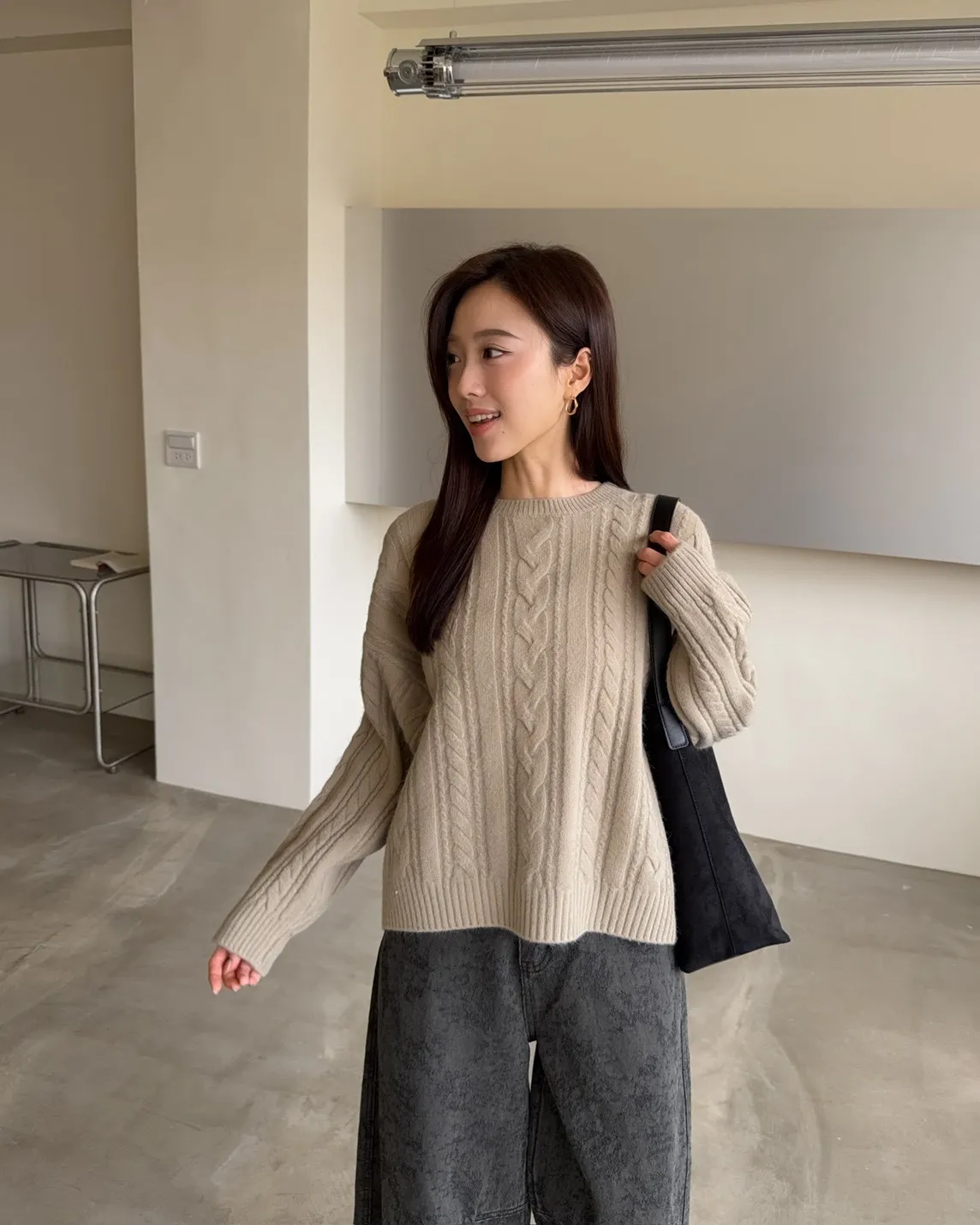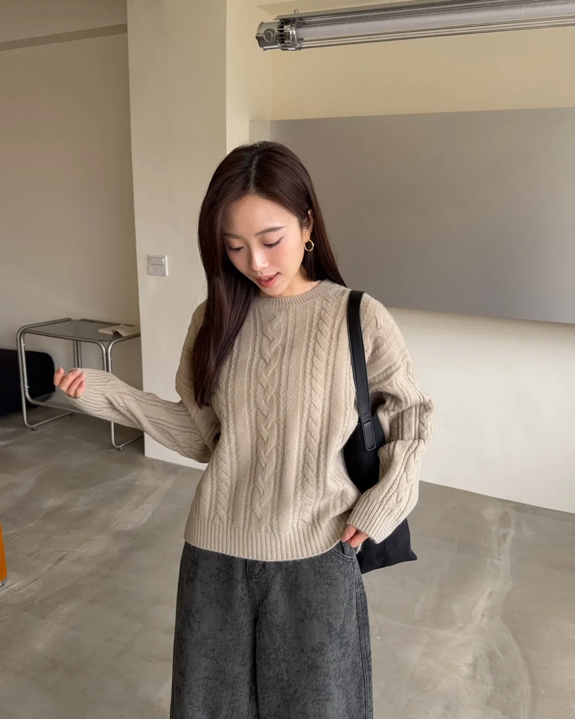 X0036文藝編織麻花辮毛衣(杏/咖啡/綠/灰)