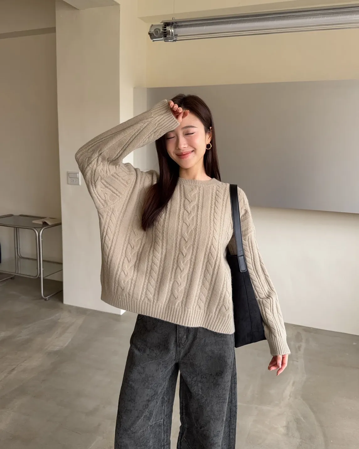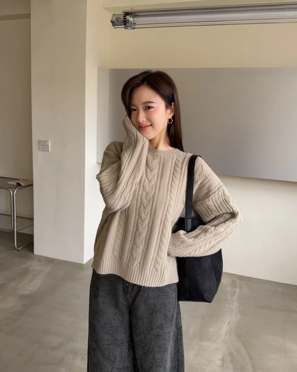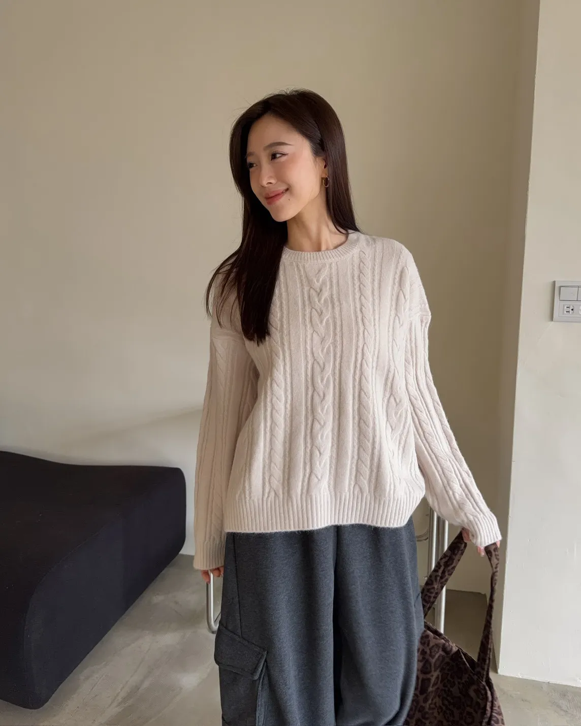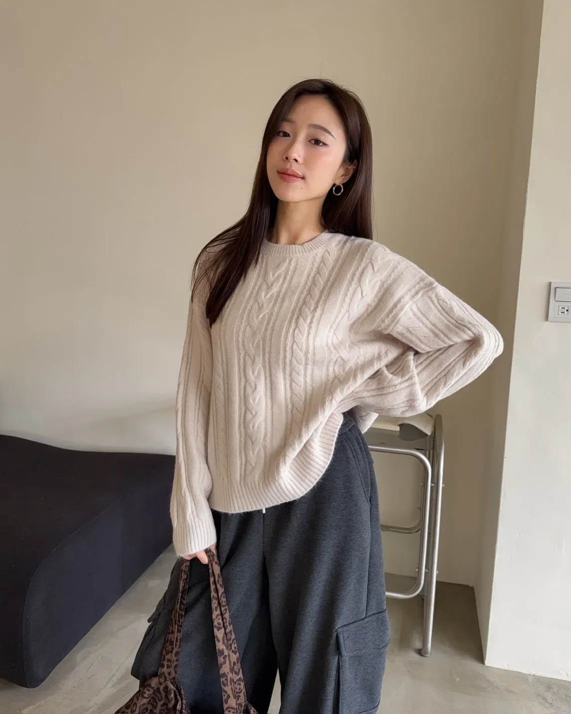 立體麻花 針織 領口/下擺/袖口螺紋滾邊 圓領