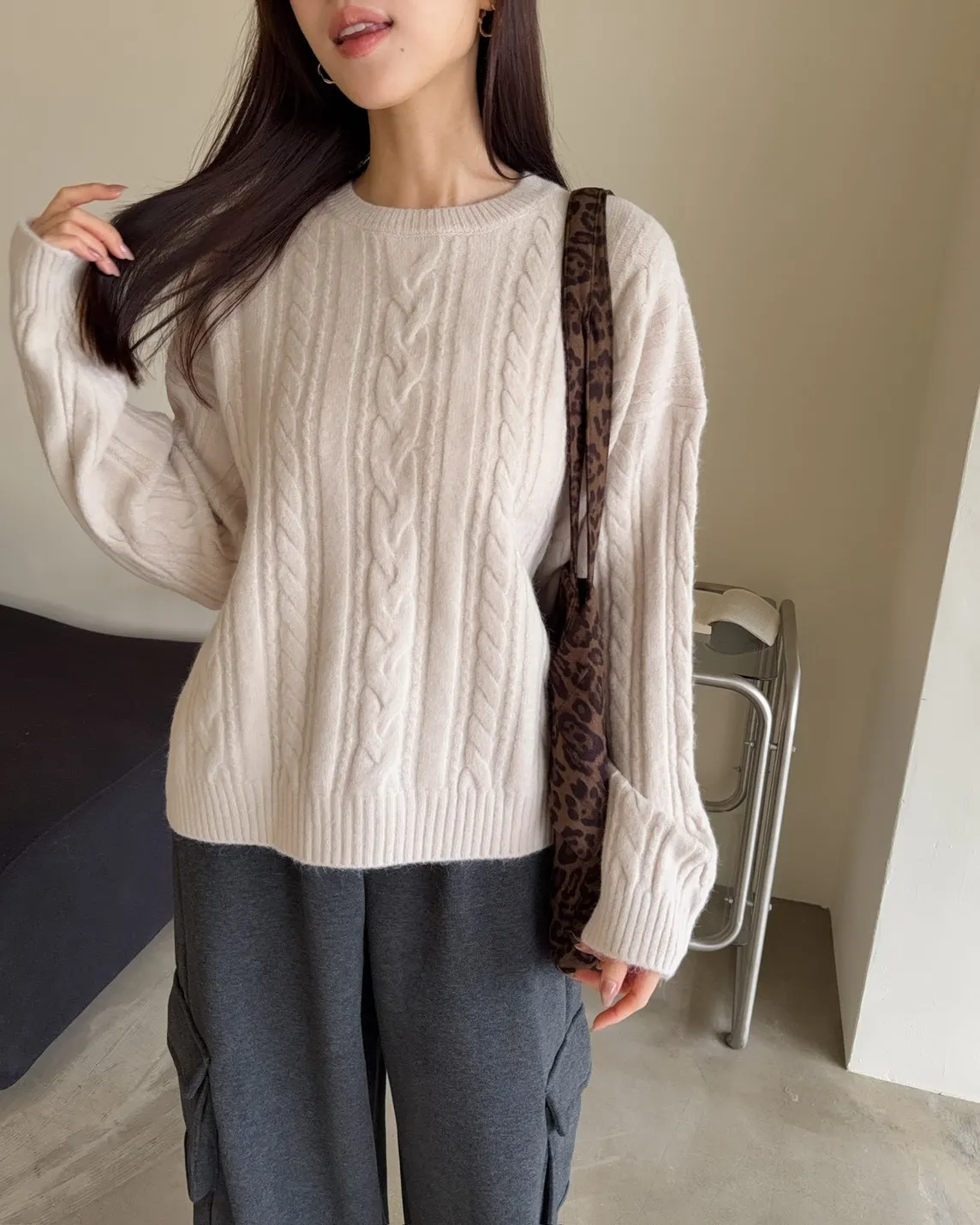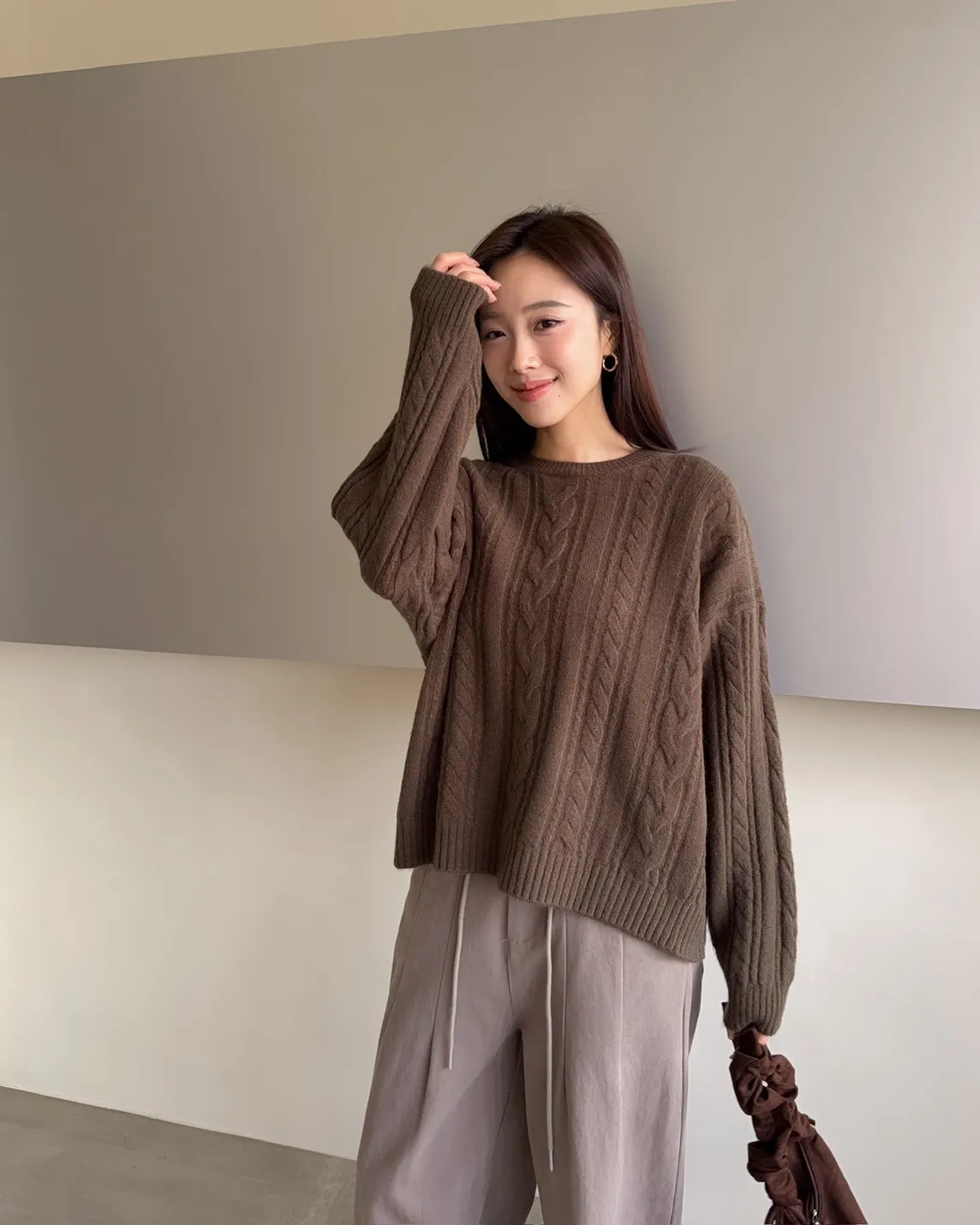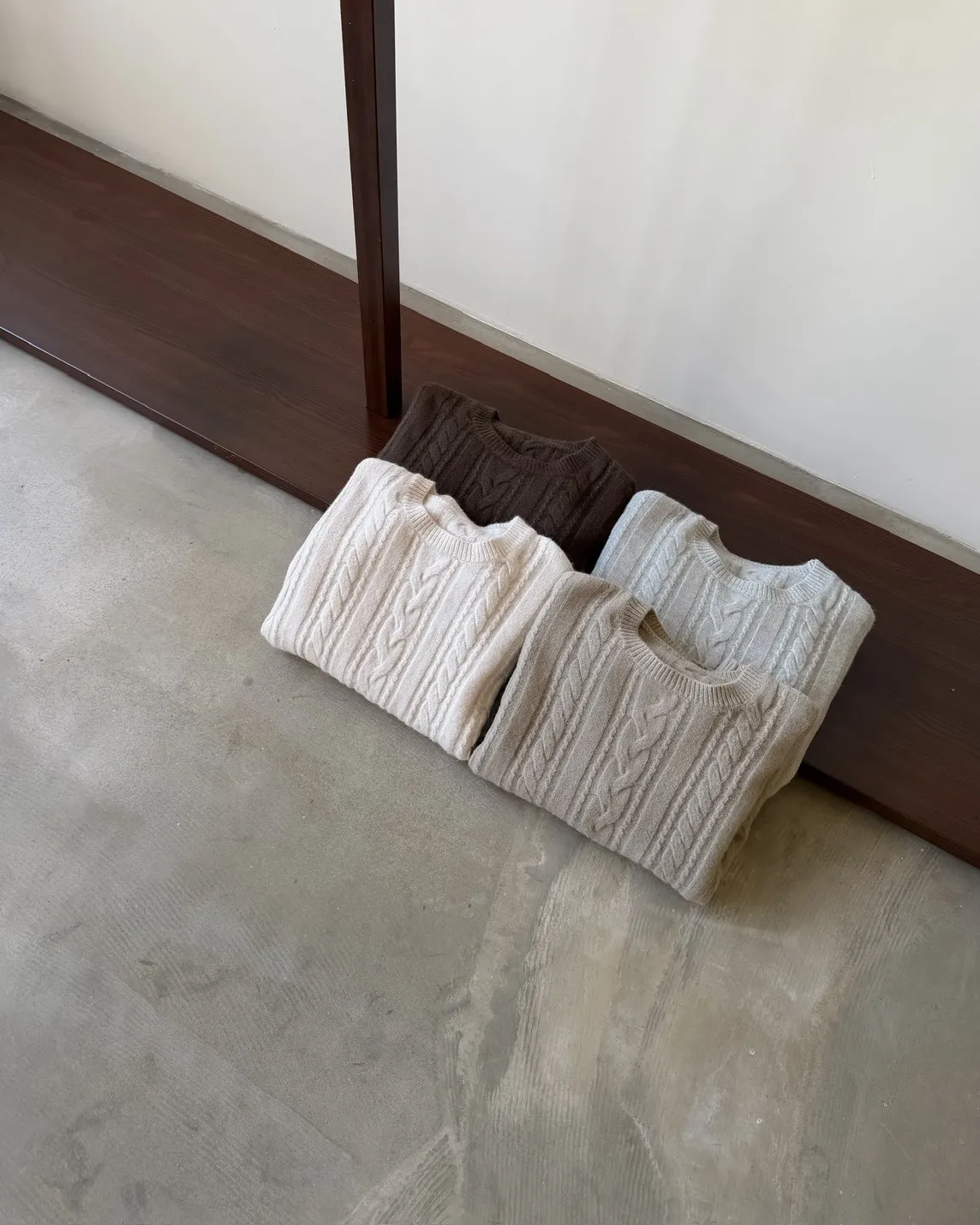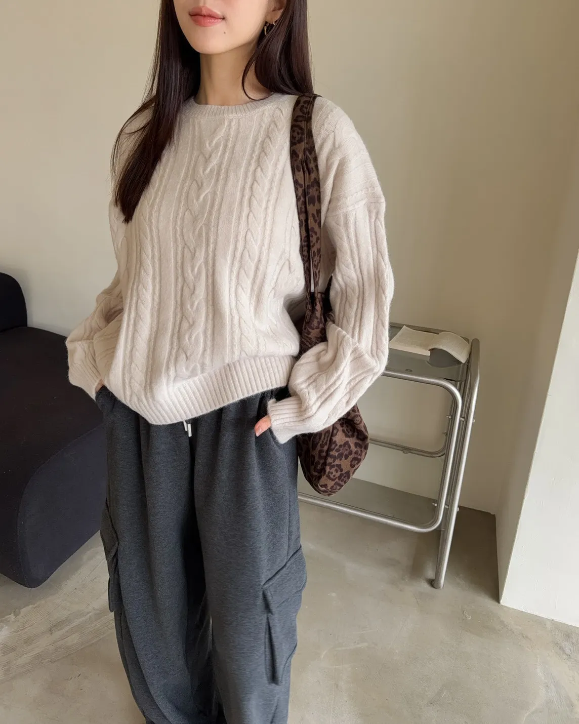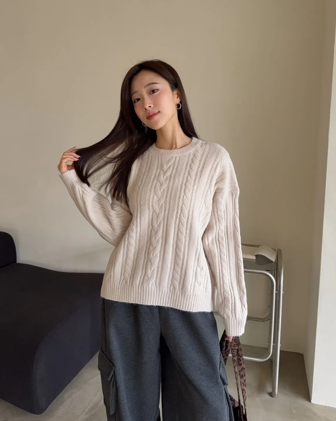 立體麻花 針織 領口/下擺/袖口螺紋滾邊 圓領