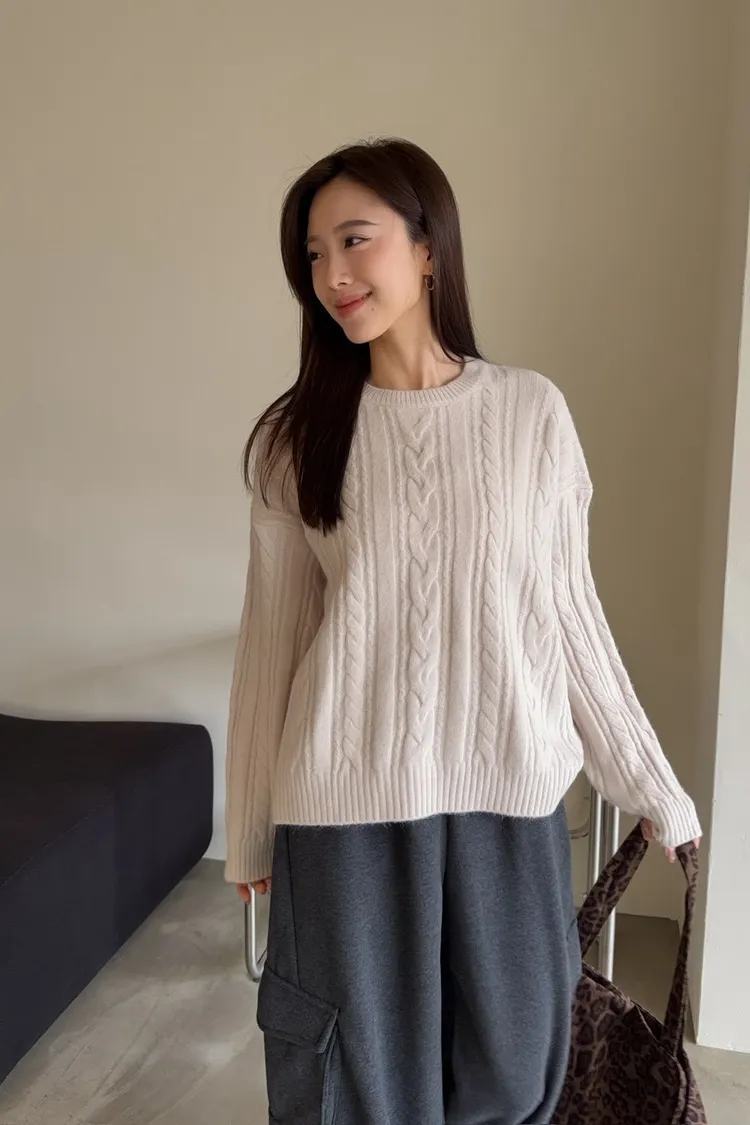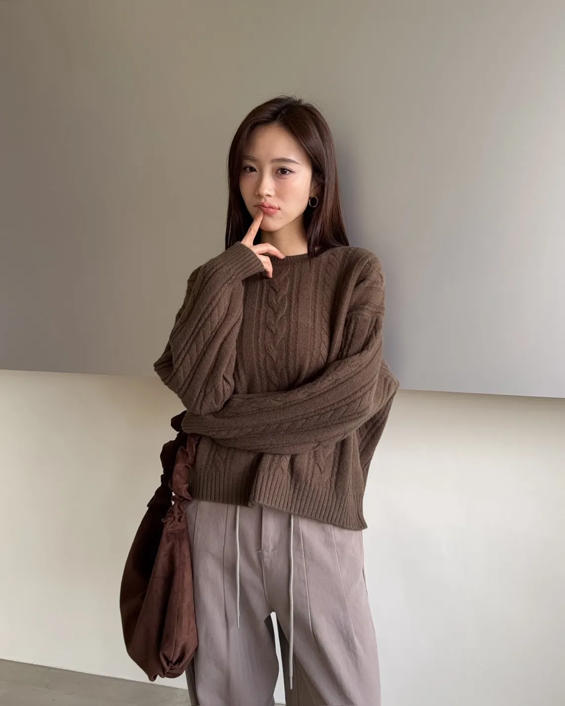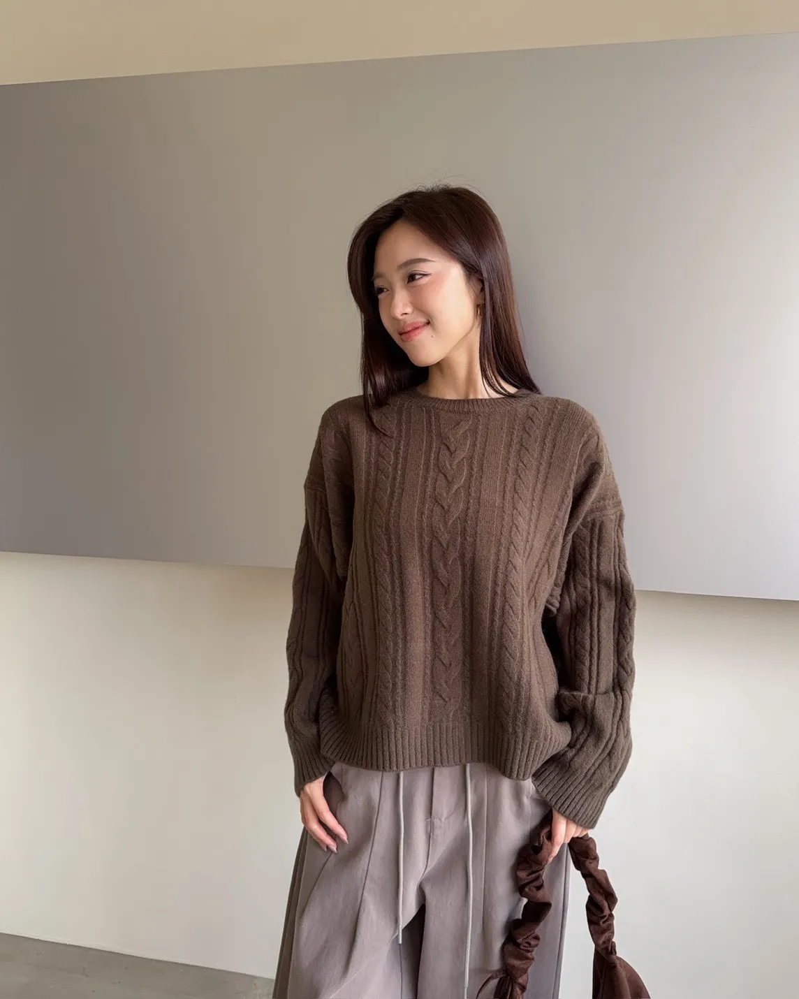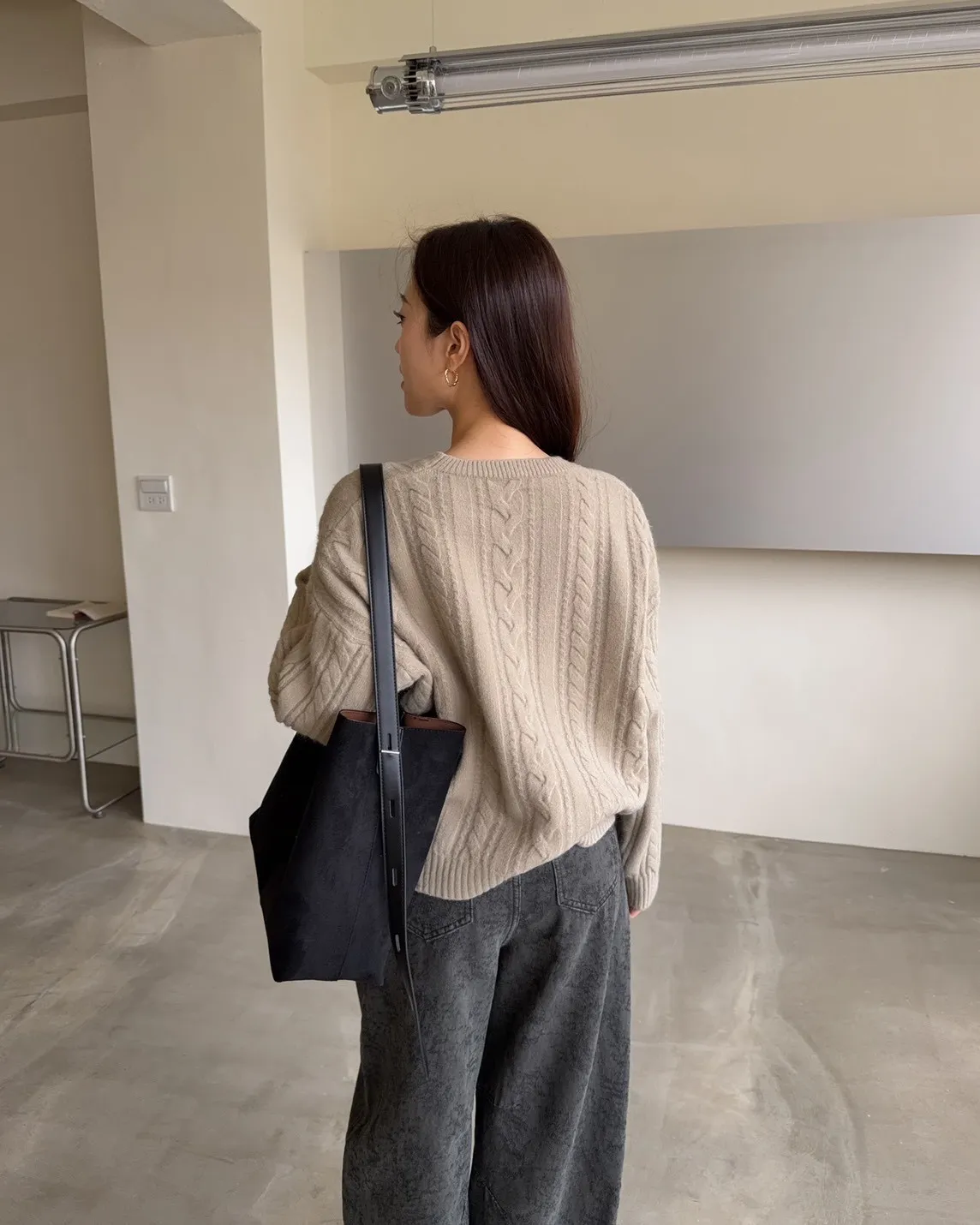 立體麻花 針織 領口/下擺/袖口螺紋滾邊 圓領