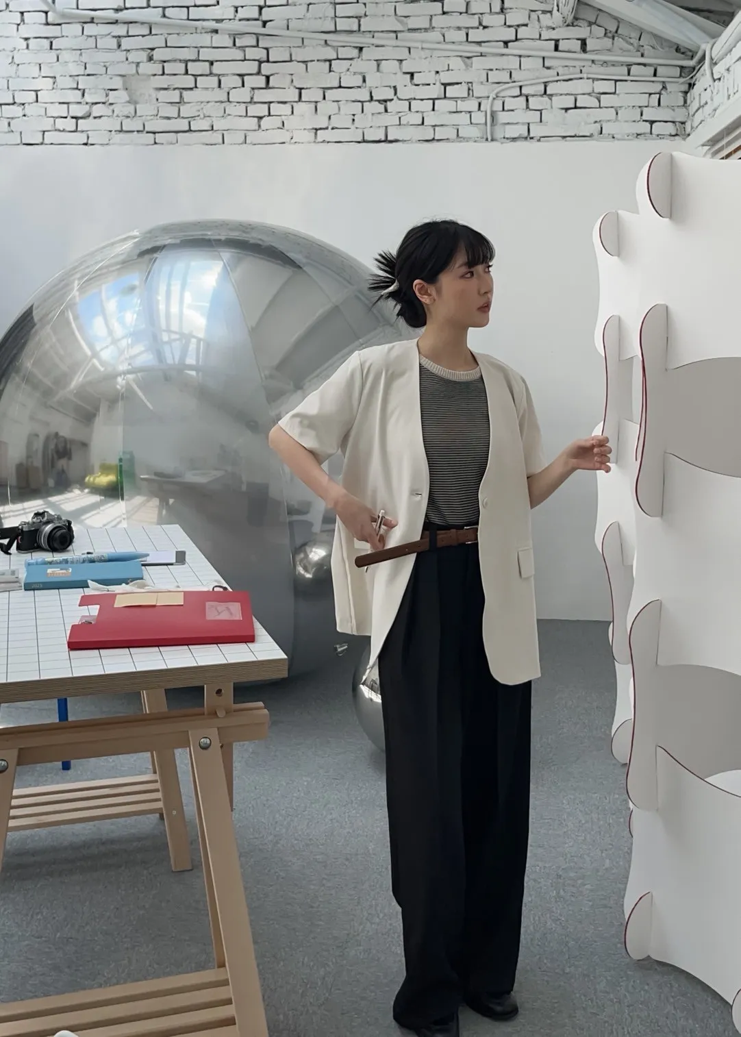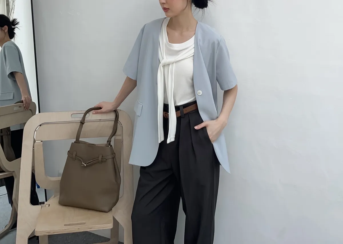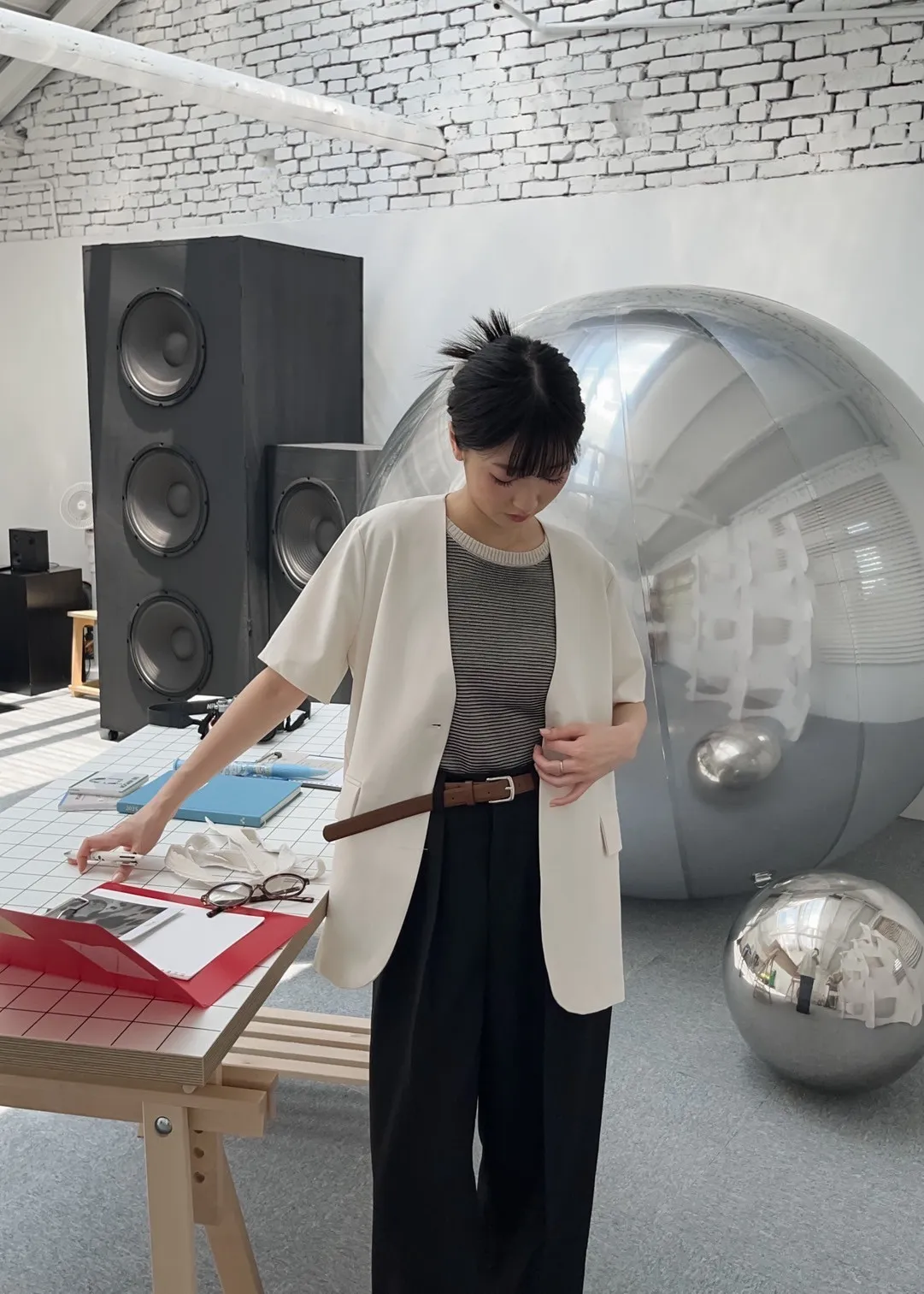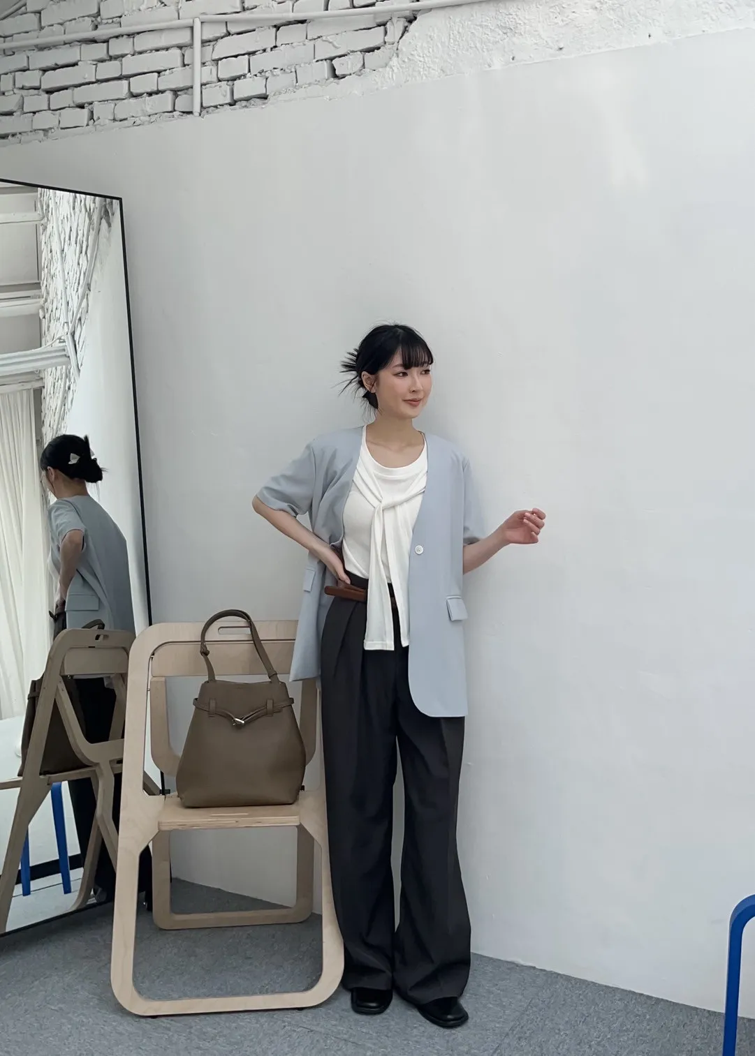 版型正常 附焦糖色皮帶 兩側口袋 前打折 壓折線 布料本身無彈性