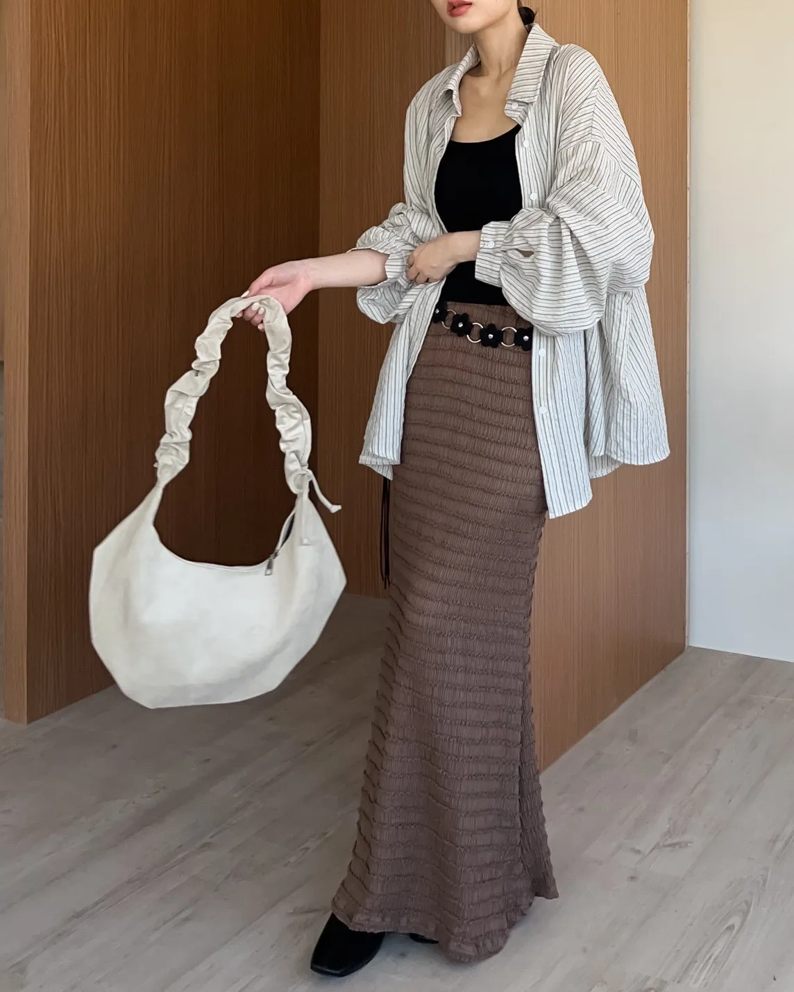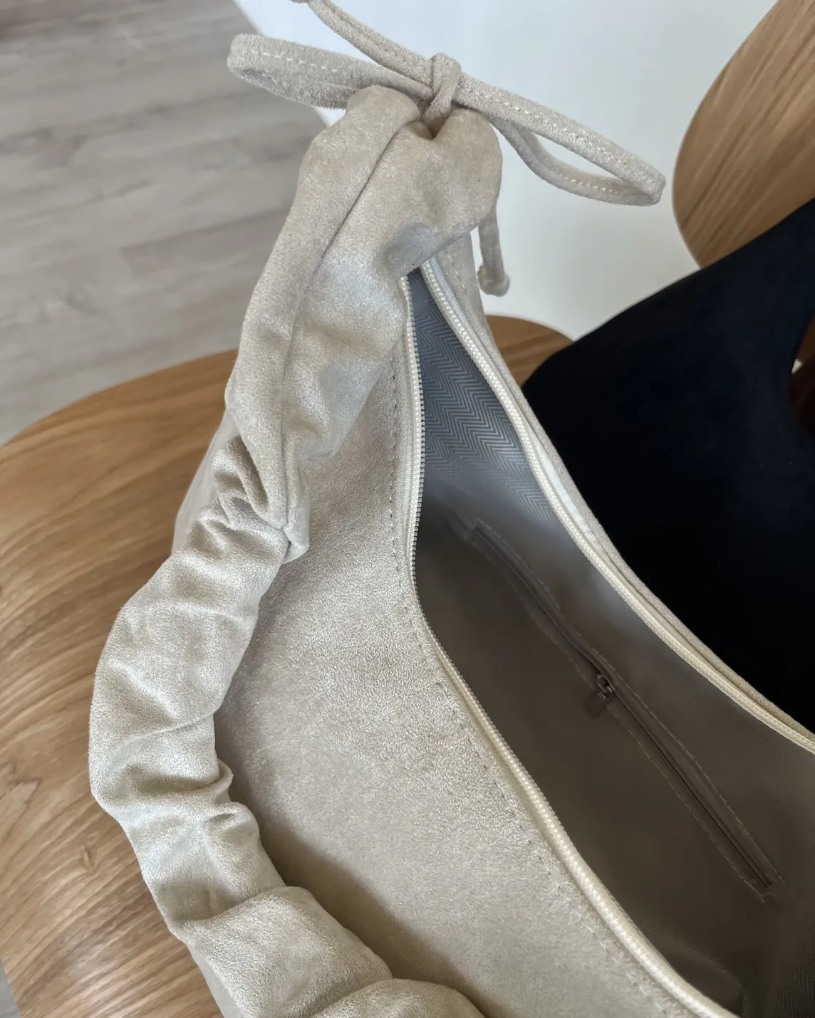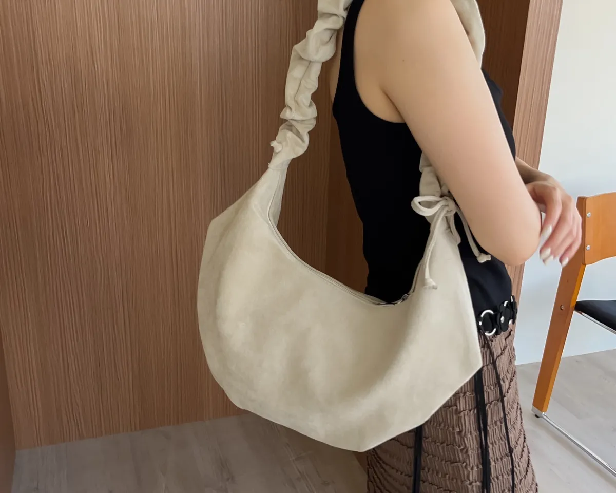 半月型 背帶可條長度(側邊抽繩調整) 兩邊抽繩可拉皺 內有一個拉鍊夾層 表面短絨 有內襯