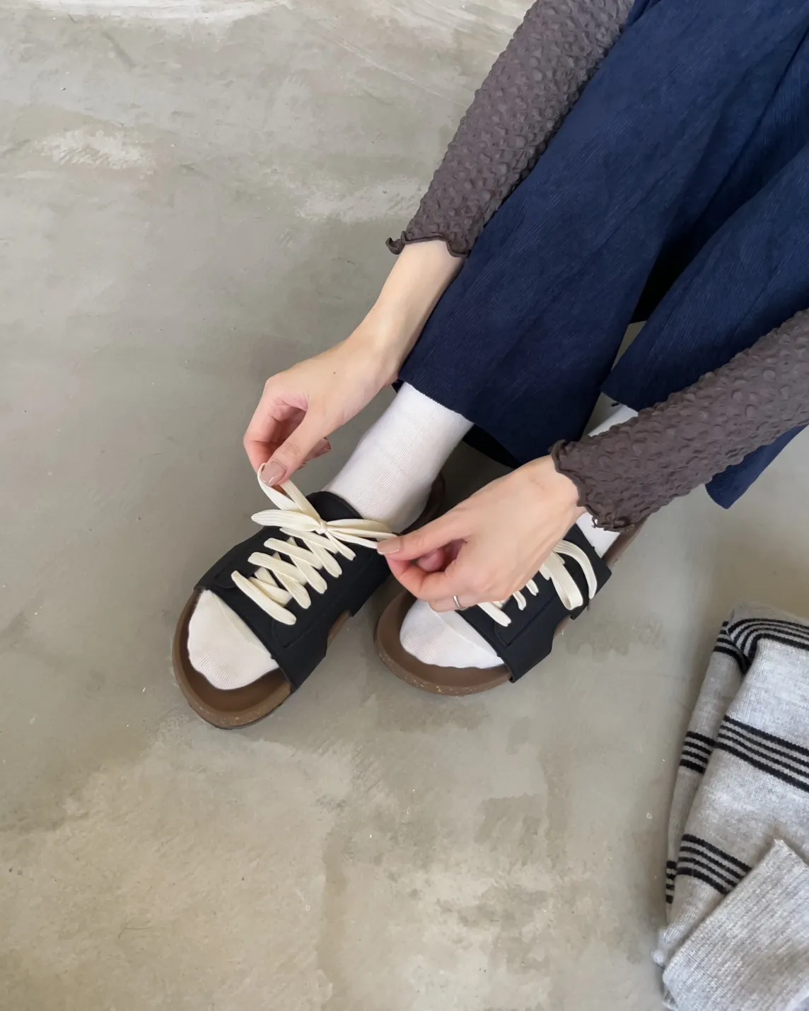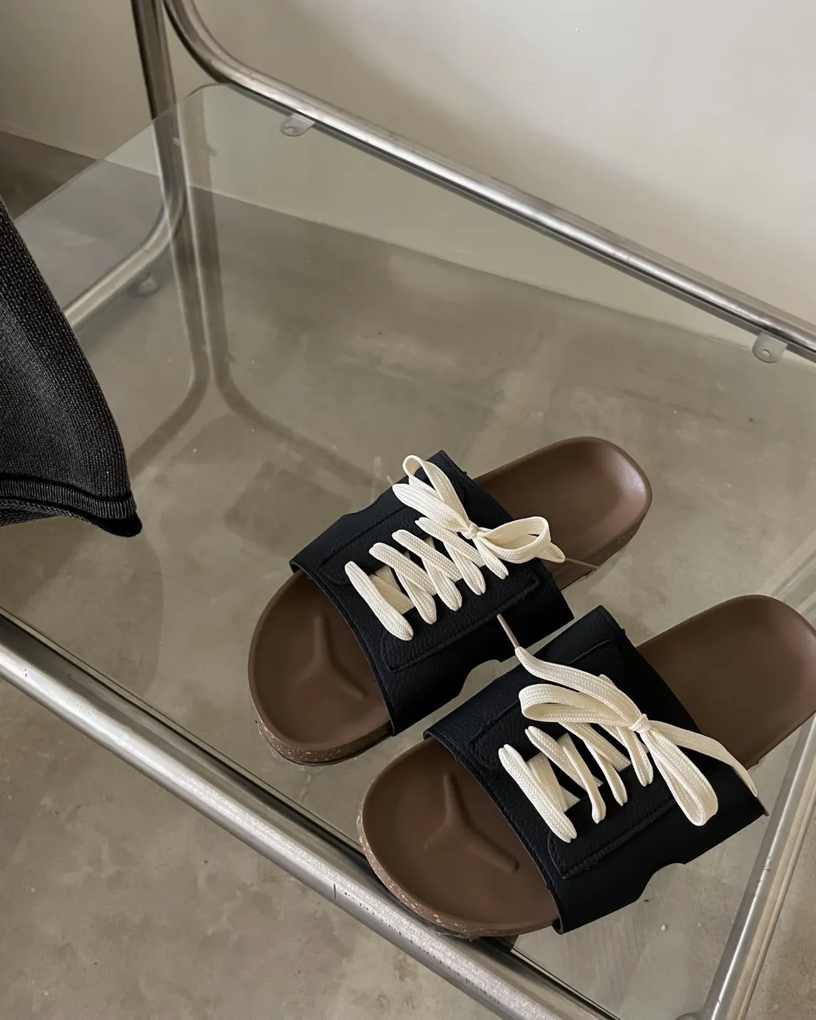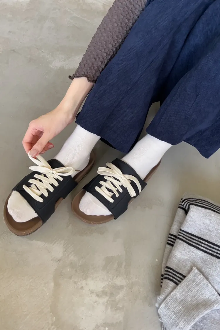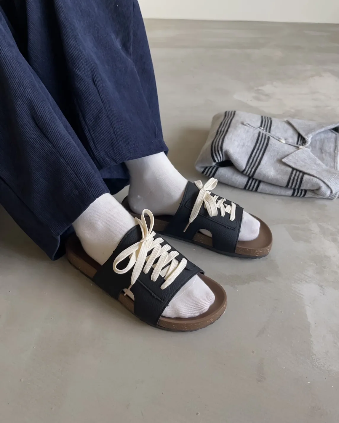 KR003隨性綁帶皮革平底拖(Koera)(黑)