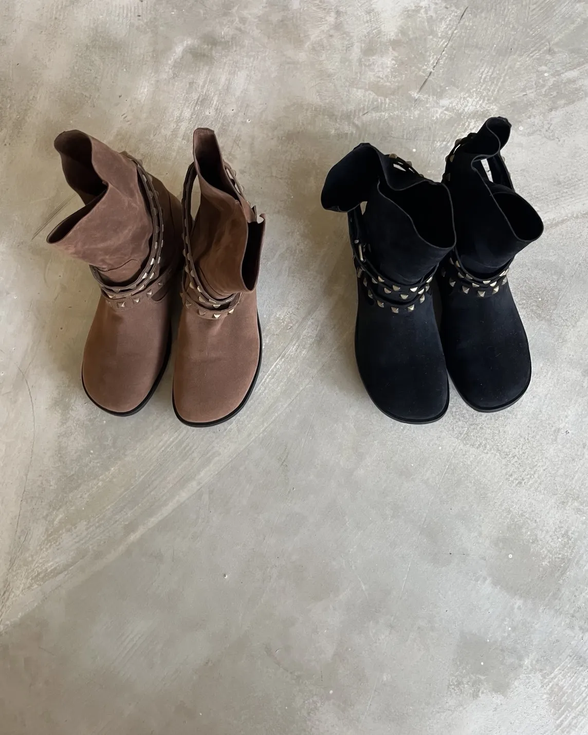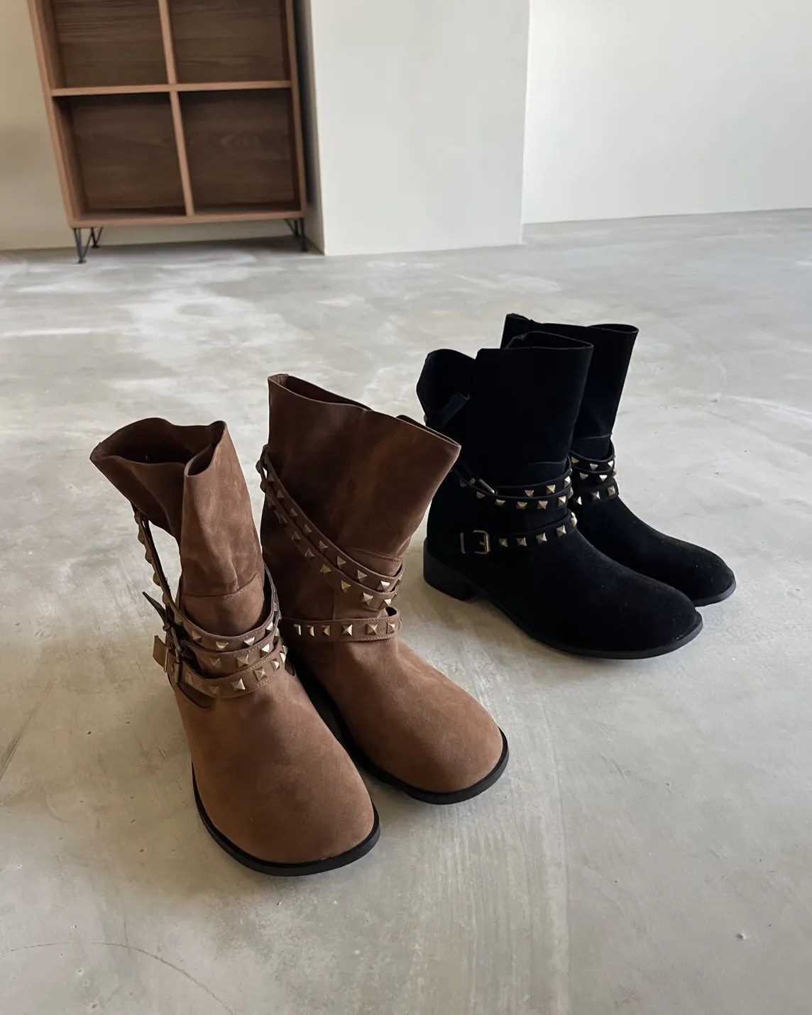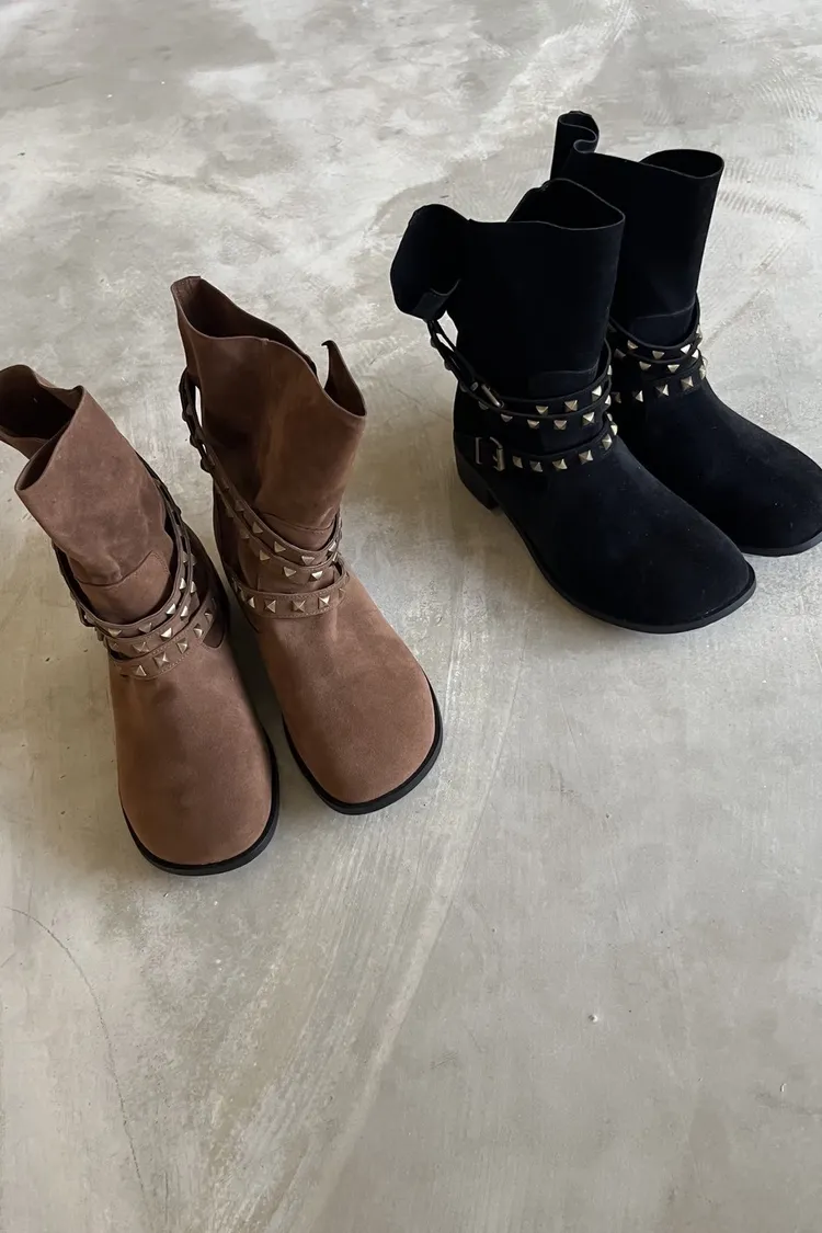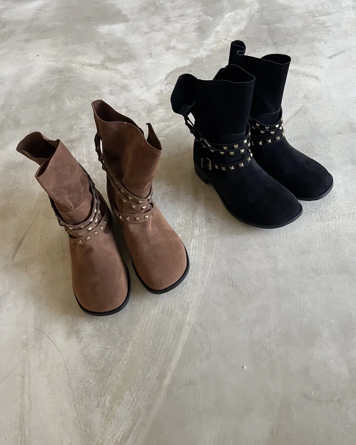 KR152鉚釘繞圈圈麂皮中筒靴(Koera)(咖啡/黑)