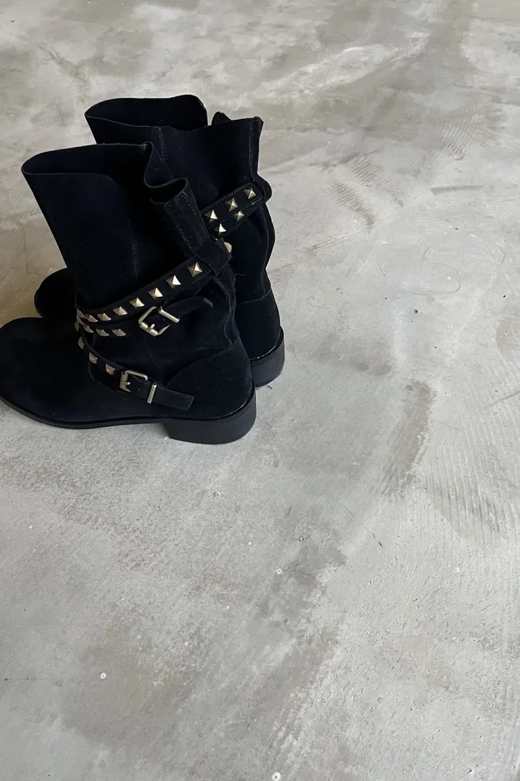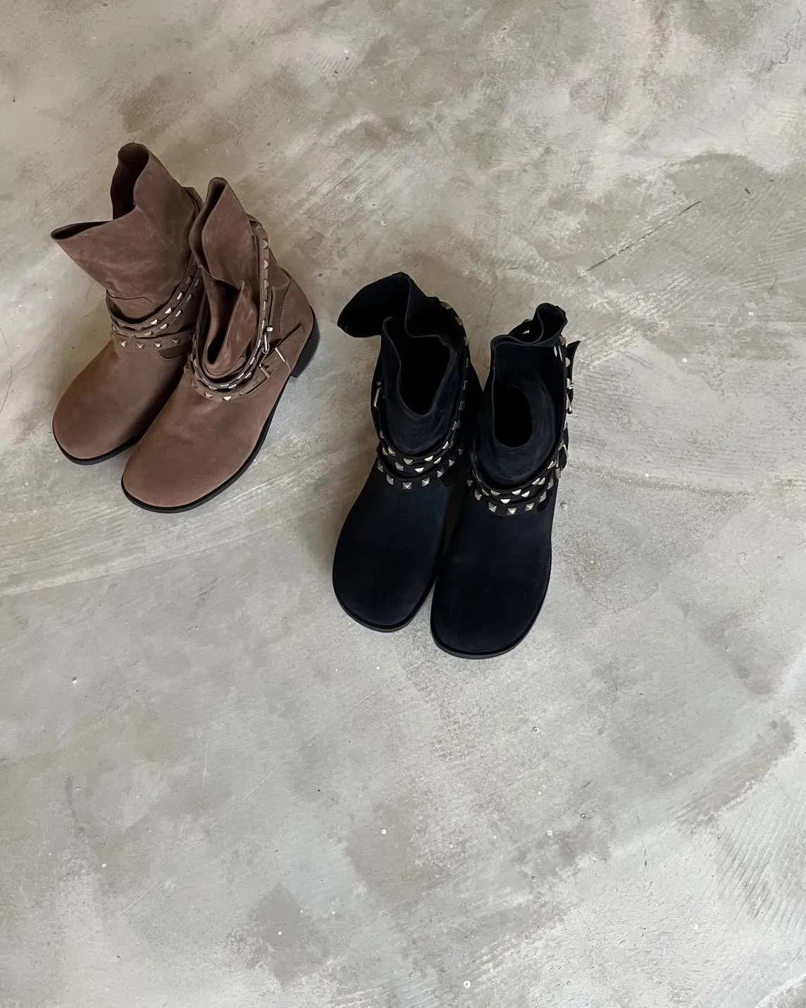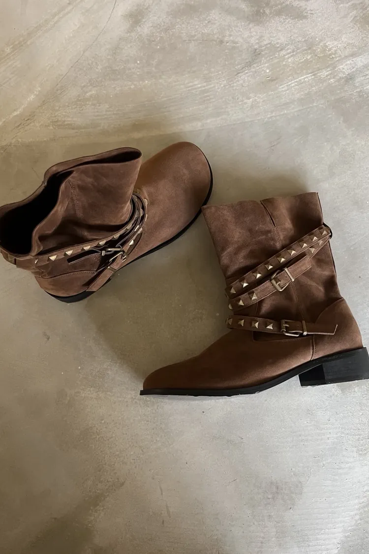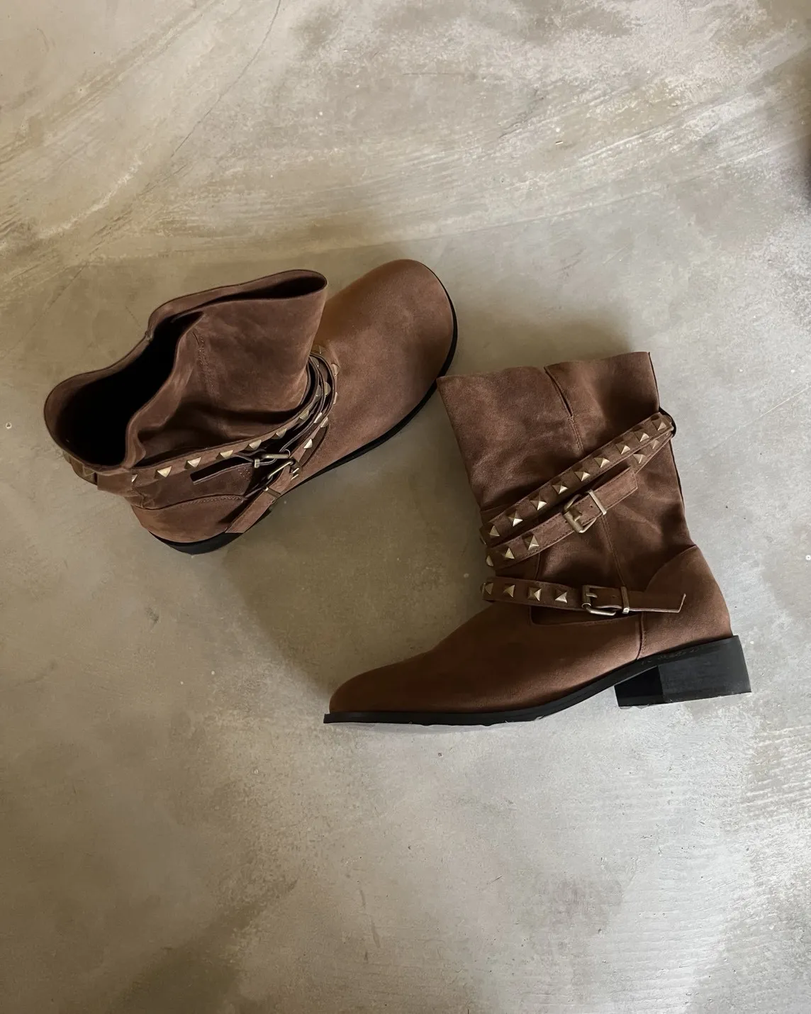 KR152鉚釘繞圈圈麂皮中筒靴(Koera)(咖啡/黑)